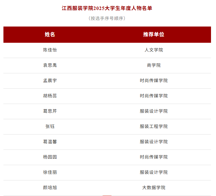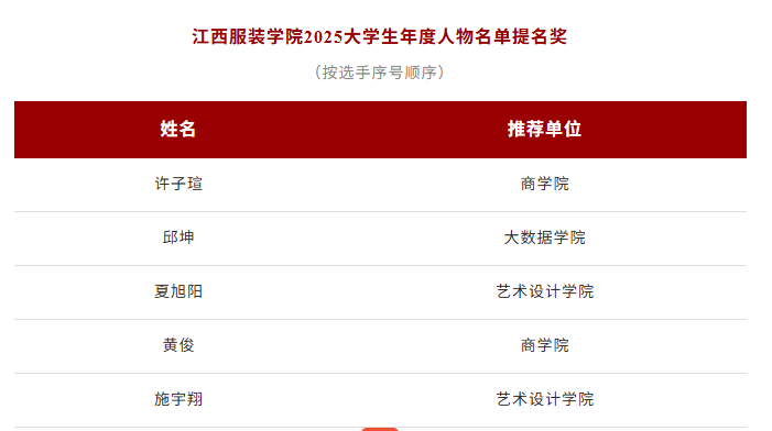 江西服装学院2025大学生年度人物是新时代江服学子优秀精神风貌的集中缩影。他们的成长故事既是身边可感可知的“鲜活榜样”,更传递出澎湃向上的青春力量。下一步,学校将以此次评选为契机,深入宣传年度人物的先进事迹,引导全体学子坚定理想信念、厚植家国情怀,在踔厉奋发中矢志报国,在刚健有为中笃行不怠,奋力书写为中国式现代化挺膺担当的青春篇章。