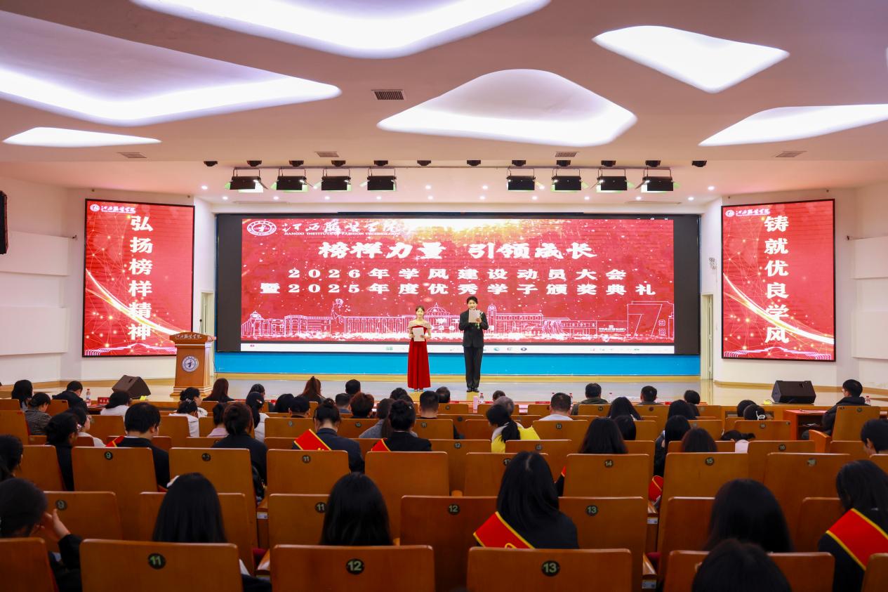 新闻中心讯(供稿/学生工作处)3月24日下午,我校在思贤楼三楼报告厅举行2026年学风建设动员大会暨2025年度优秀学子颁奖典礼。校党委副书记唐新强、校长助理尹娜娜出席典礼,相关职能部门负责人、二级学院党委(党总支)书记、教师代表及学生代表等400余人齐聚一堂,共同见证荣耀时刻,凝聚奋进力量。