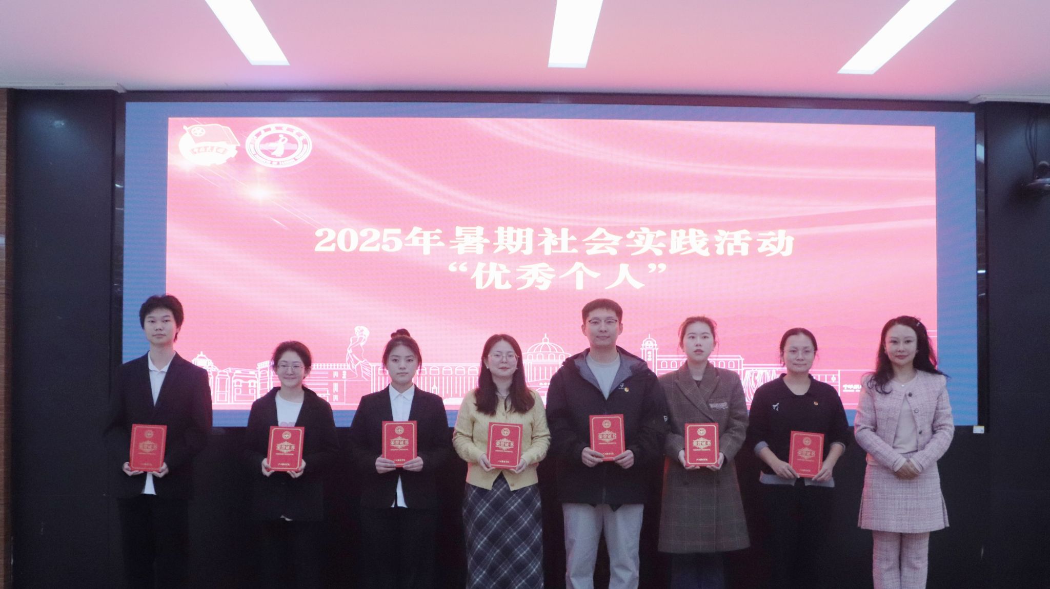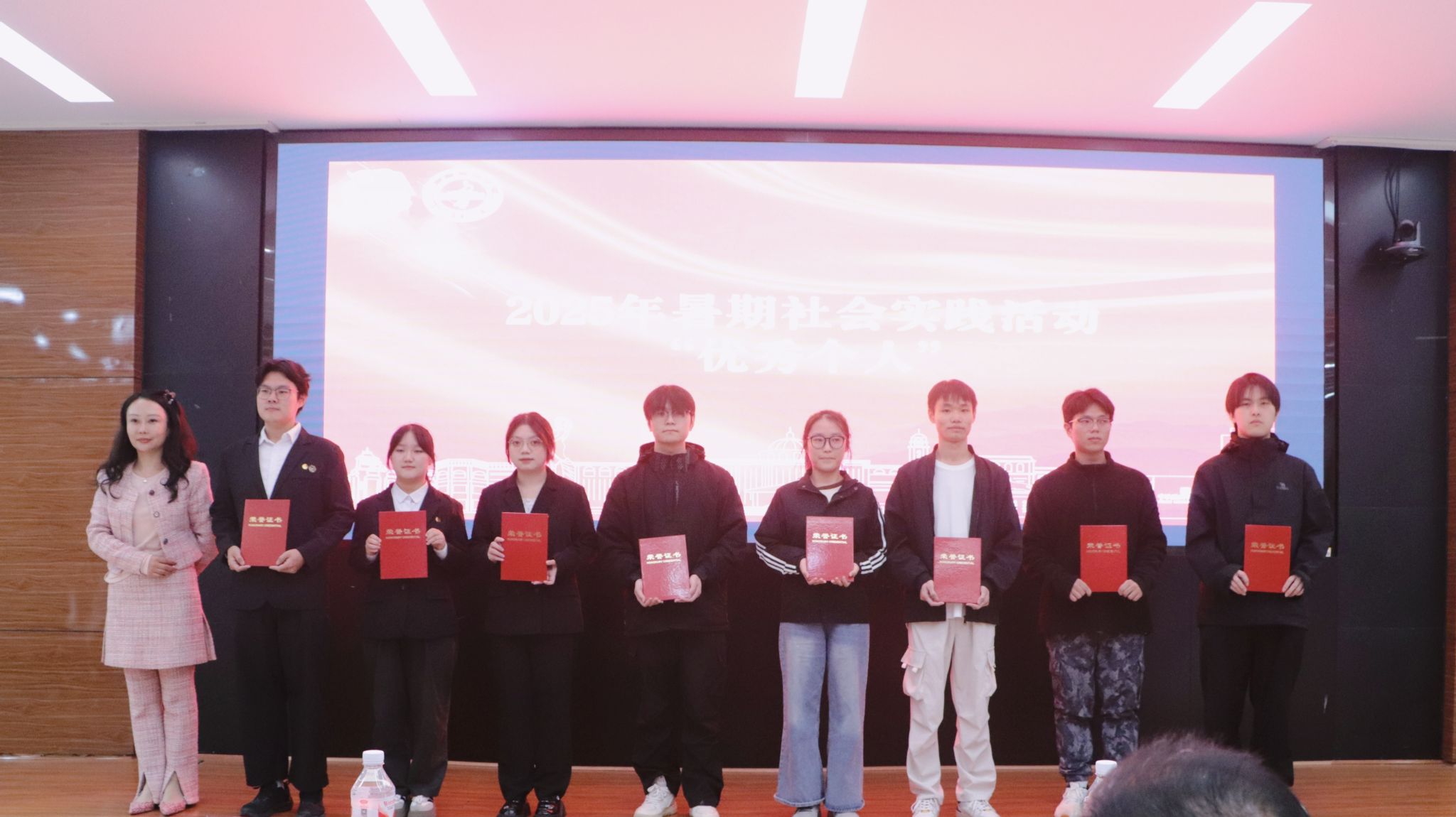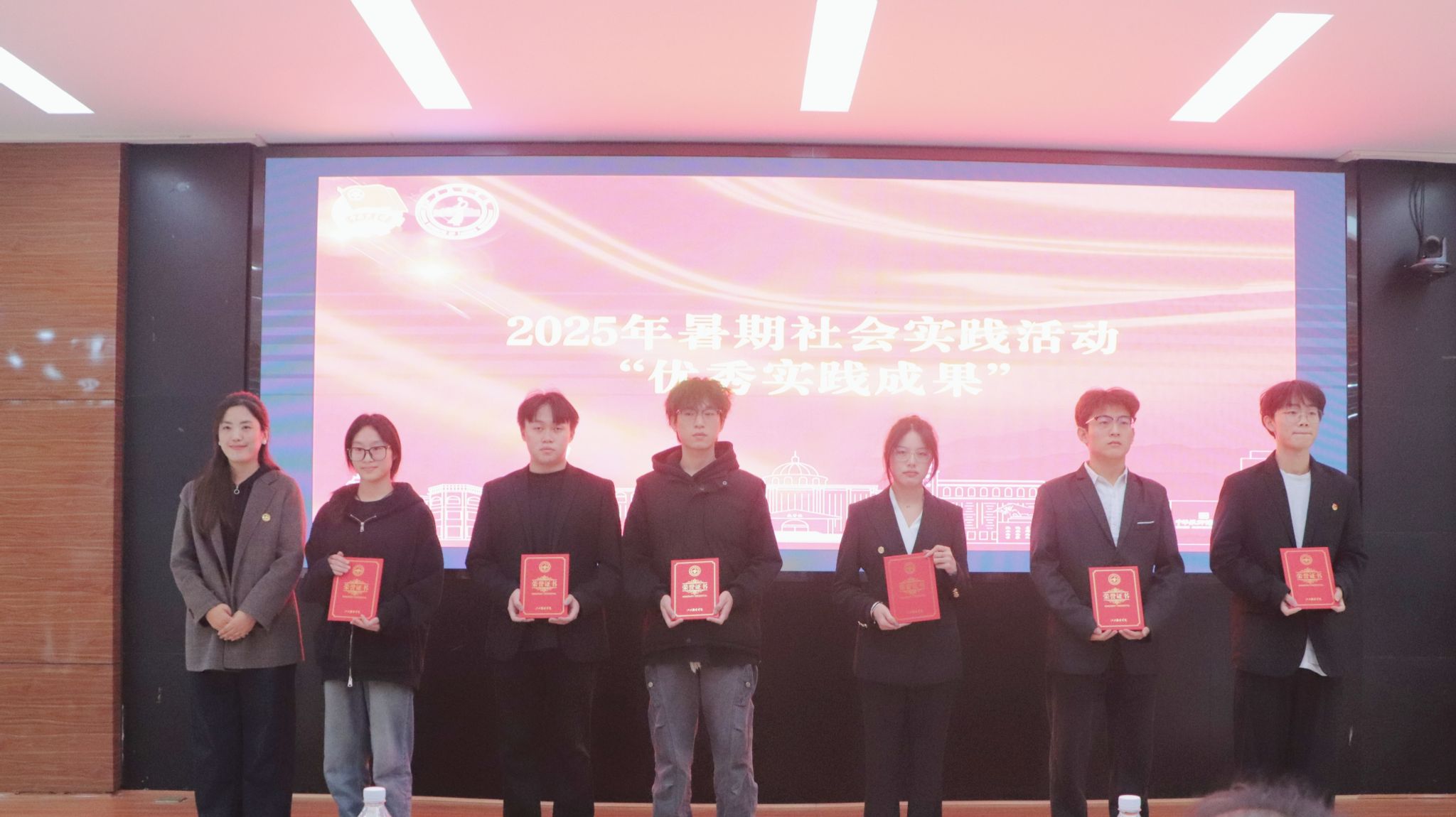 颁奖仪式环节,与会领导分别为获奖集体和个人颁发证书与奖牌。受表彰者手持荣誉证书,脸上洋溢着自豪与喜悦,现场掌声阵阵,气氛热烈,充分激发了全体师生参与社会实践的积极性与荣誉感。