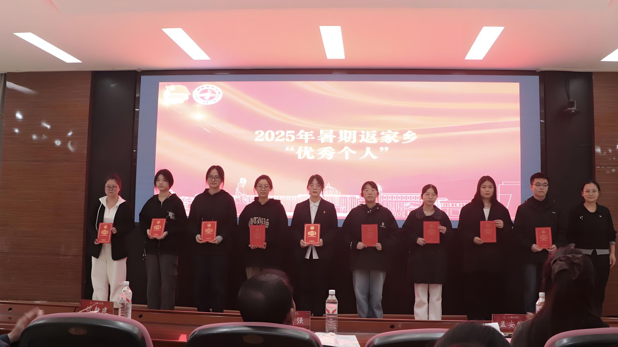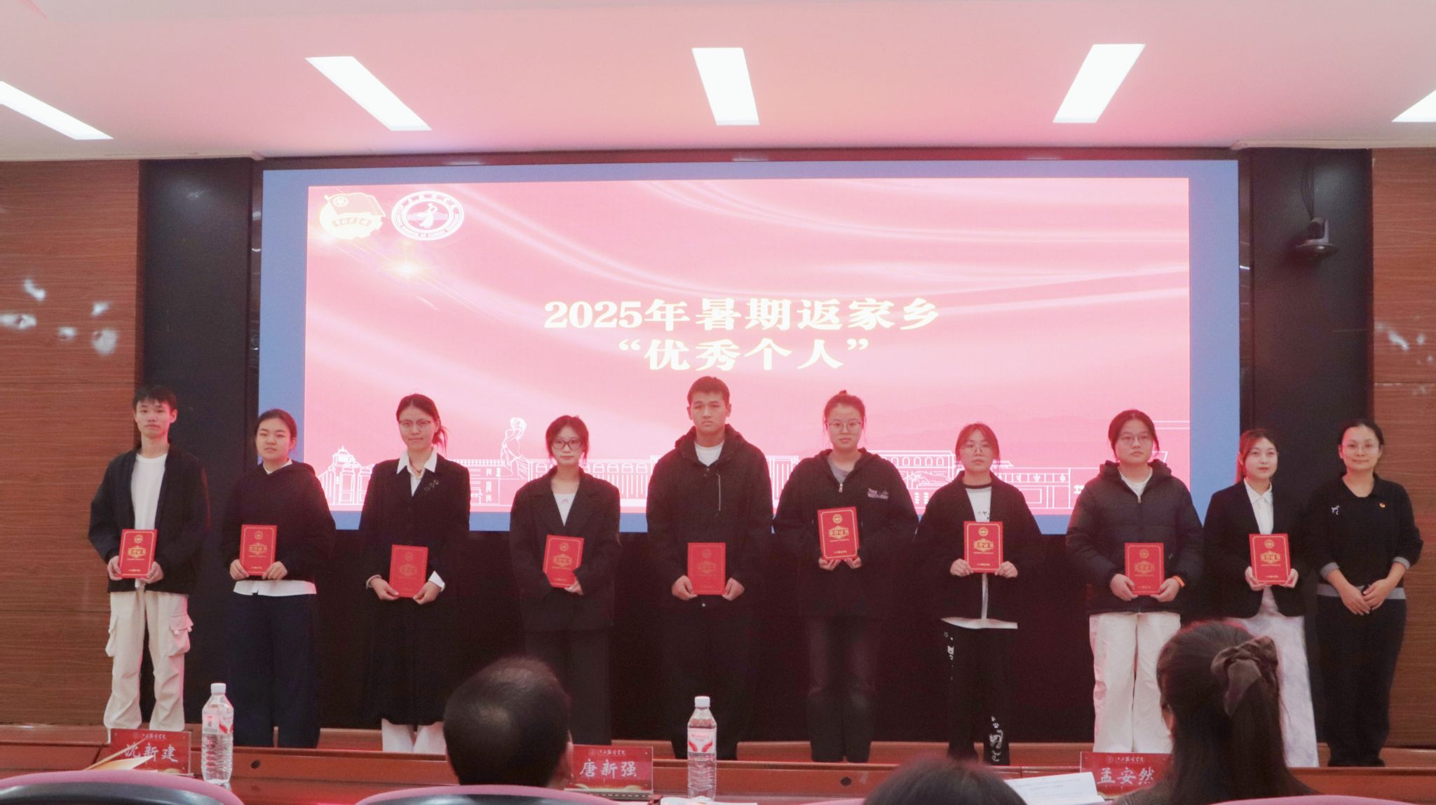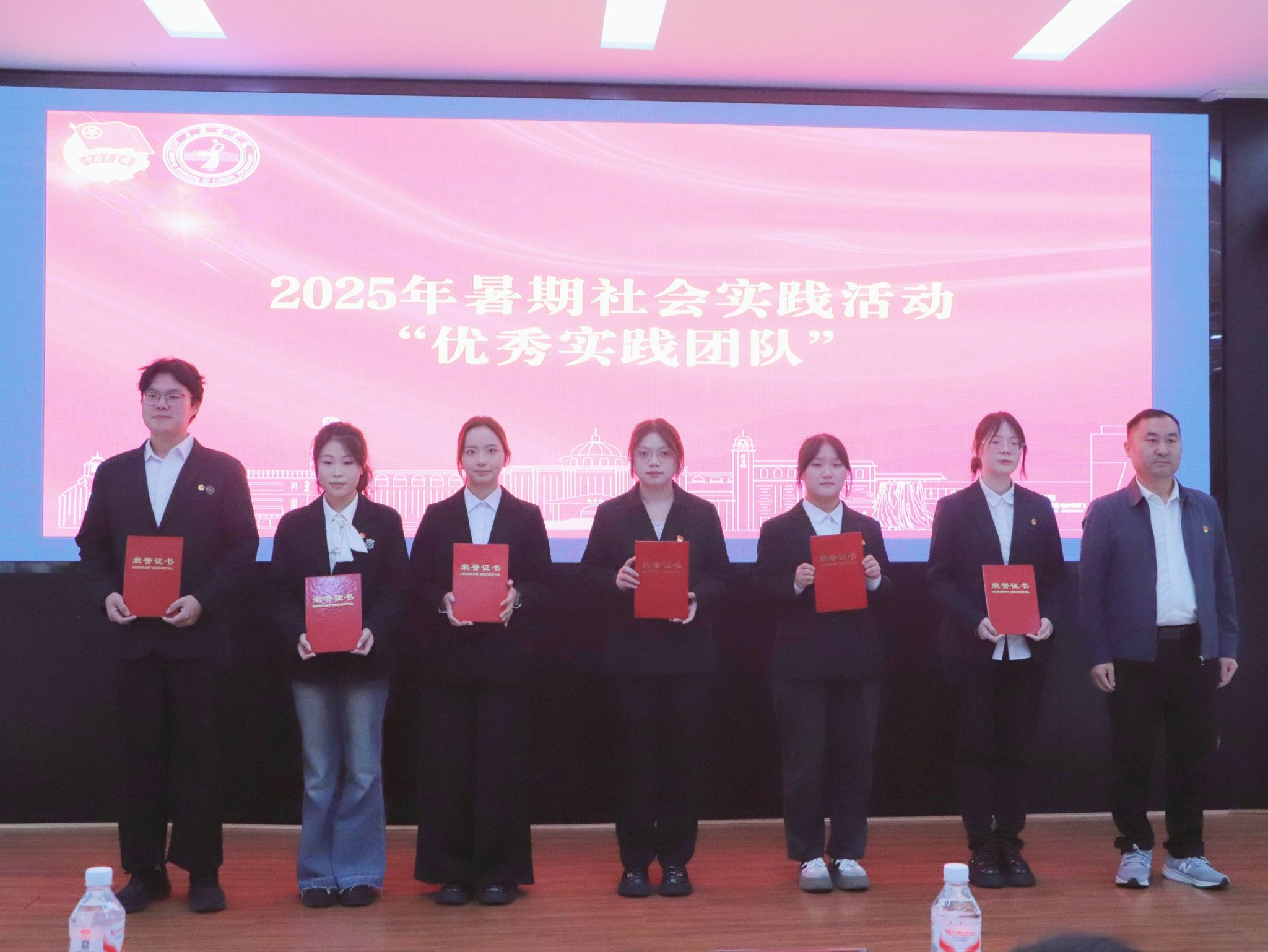 颁奖仪式环节,与会领导分别为获奖集体和个人颁发证书与奖牌。受表彰者手持荣誉证书,脸上洋溢着自豪与喜悦,现场掌声阵阵,气氛热烈,充分激发了全体师生参与社会实践的积极性与荣誉感。