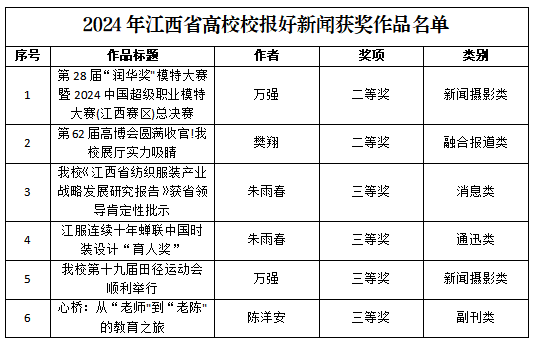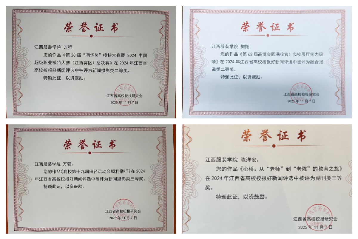论坛表彰环节,2024年度江西省高校校报好新闻评选结果揭晓。该评选由研究会主办,是衡量全省高校校报业务水平的权威赛事,设消息、通讯等多个类别,南昌大学、江西师范大学、江西财经大学等重点高校均有作品获奖,彰显全省校报建设整体实力。我校选送作品脱颖而出,斩获6项奖项——新闻摄影类《第28届“润华奖”模特大赛暨2024中国超级职业模特大赛(江西赛区)总决赛》、融合报道类《第62届高博会圆满收官!我校展厅实力吸睛》获二等奖;消息类《我校〈江西省纺织服装产业战略发展研究报告〉获省领导肯定性批示》、通讯类《江服连续十年蝉联中国时装设计“育人奖》、新闻摄影类《我校第十九届田径运动会顺利举行》、副刊类《心桥:从“老师”到“老陈”的教育之旅》获三等奖,覆盖传统与新兴业态,凸显内容功底与创新探索。