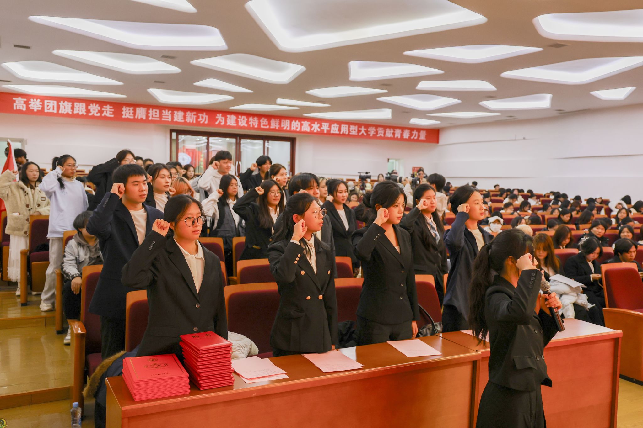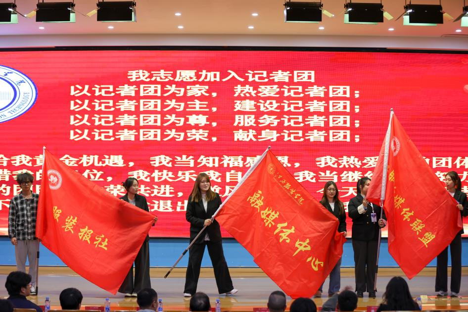 在庄重肃穆的传承仪式上,第二十届各学生组织负责人将团旗郑重交予第二十一届新任负责人,完成了使命的交接与精神的延续。新任江服大学生记者团秘书长带领新一届大学生记者团成员面向团旗庄严宣誓,全体成员高举右拳,铿锵誓言交织汇聚,充分彰显了新一代宣传工作者的使命感与责任感。