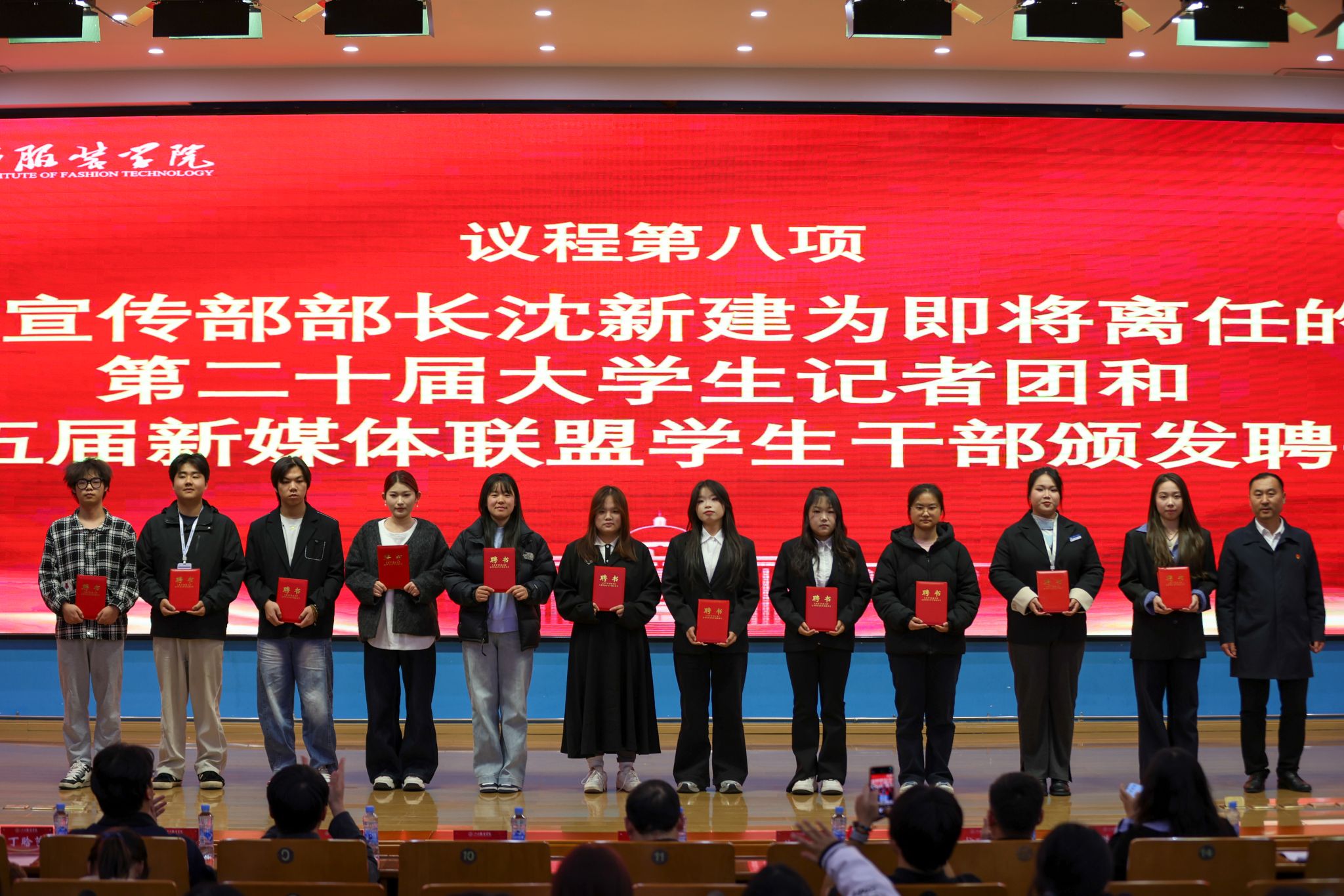 宣传教育科科长万强宣读了《关于表彰2025年江西服装学院优秀学生记者、优秀实习记者、优秀部门的决定》。宣传部副部长朱雨春宣读《关于2025年江西服装学院党委宣传部大学生记者团任职的决定》。随后,与会指导老师共同为获奖学生和部门颁发荣誉证书,为离任的第二十届学生干部颁发聘书。