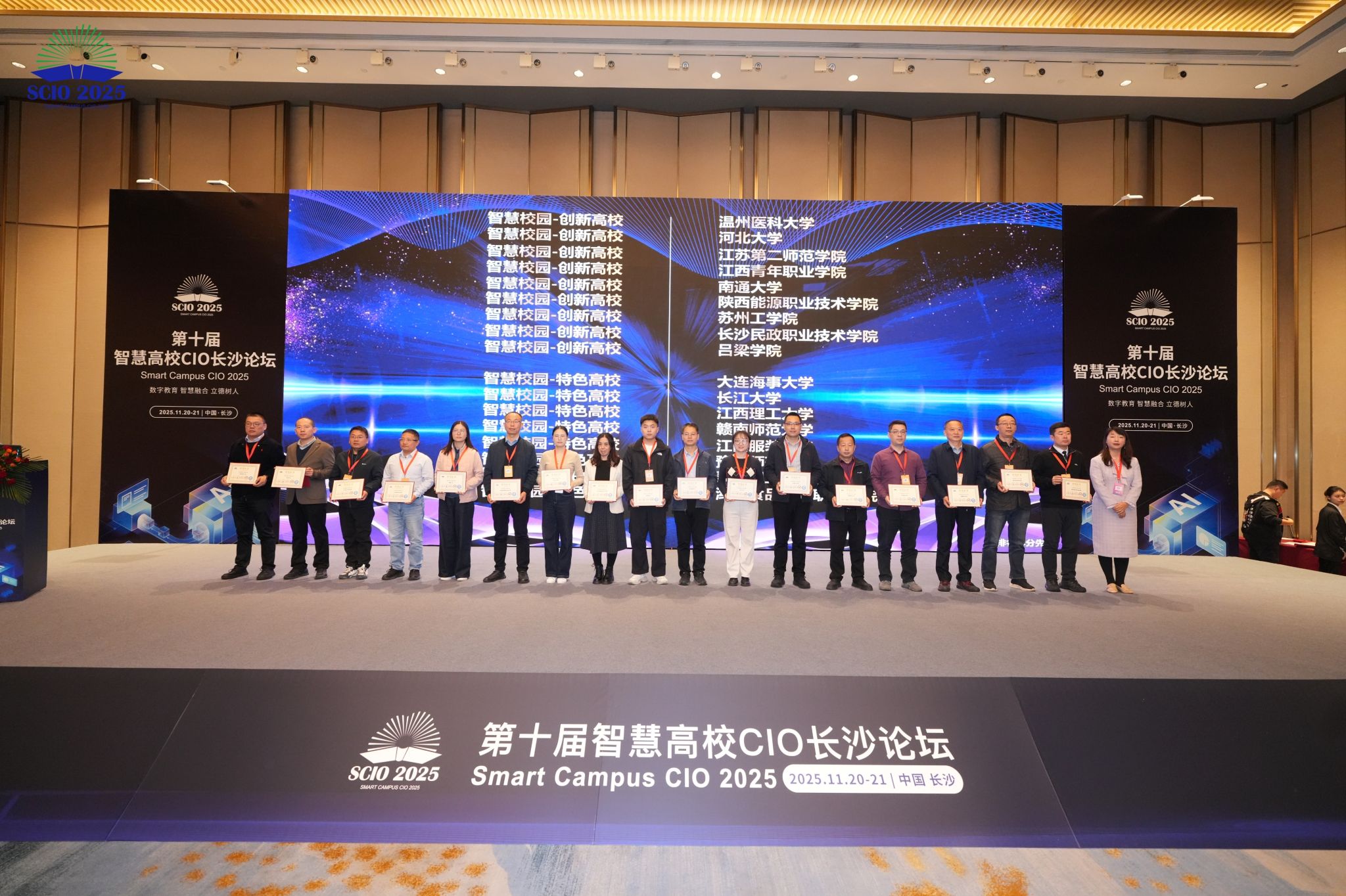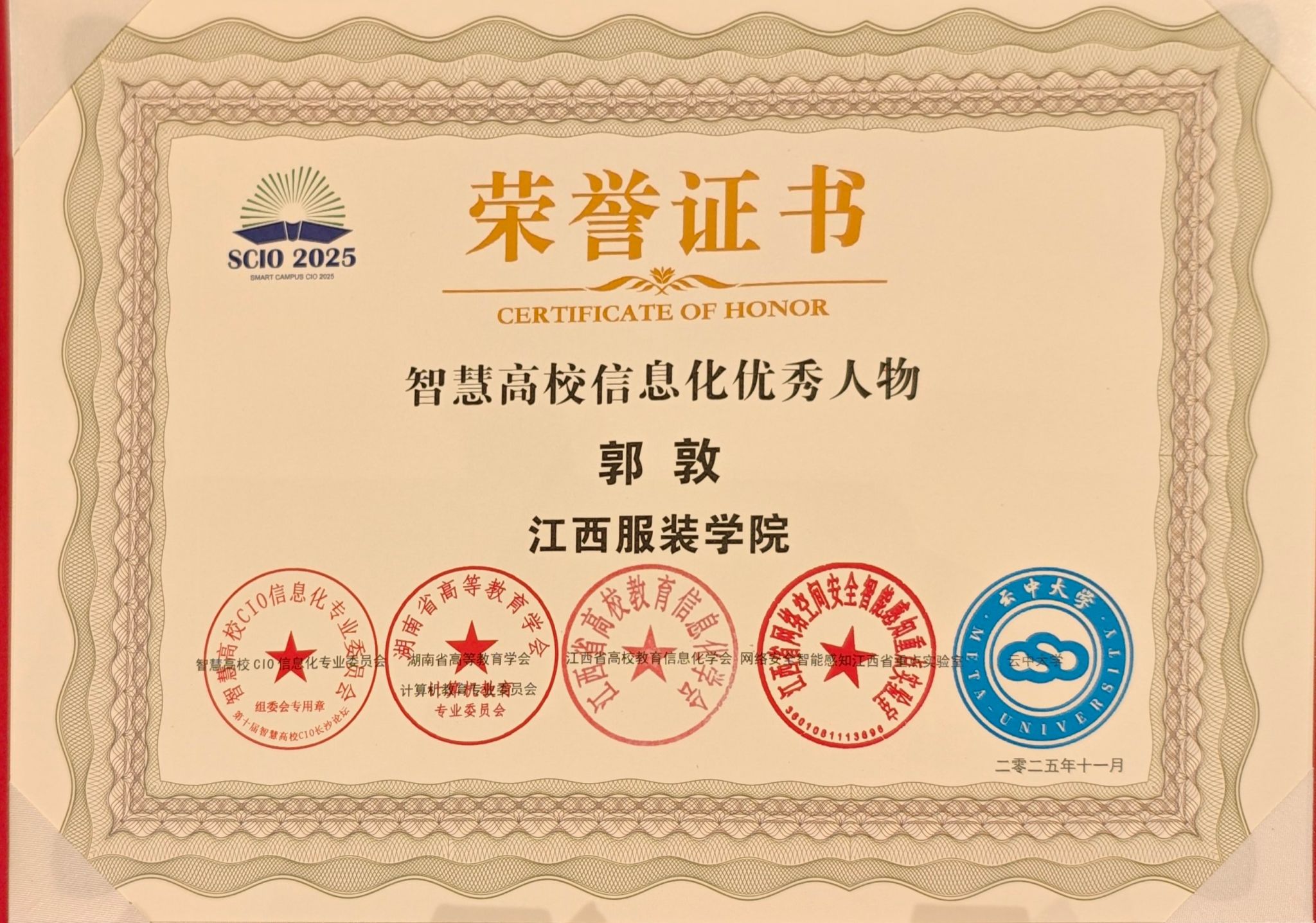 在论坛期间举办的2025年度“智慧高校凌云奖”评选活动中,经过评审委员会多轮严谨的评议,江西服装学院凭借在数字化建设领域的特色创新与卓越成效,荣获“智慧校园-特色高校”奖项;同时,我校网络与信息化管理中心主任郭敦荣获“智慧高校信息化优秀人物”称号。