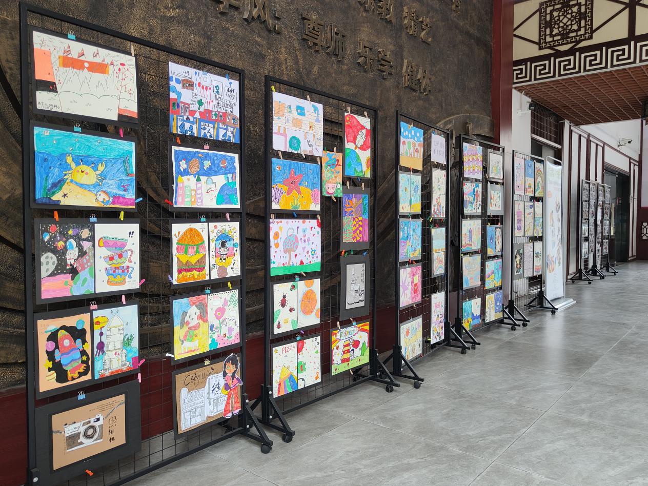 展览精心设置“童画世界”“师艺匠心”“时光长廊”三大核心板块,将美育成果与思政教育内涵深度融合。“童画世界”展出66件小学生精选作品,孩子们以纯净笔触勾勒出童心图景,传递出向上向善的精神底色;“师艺匠心”呈现25件学校·实习教师的创作作品及教学心得,彰显了江服学子们将专业艺术知识与思政教育理念融入教学实践的思考;“时光长廊”通过纪实摄影,定格了师生互动温情瞬间与思维碰撞精彩时刻,直观展现了校地美育思政实践的生动过程。