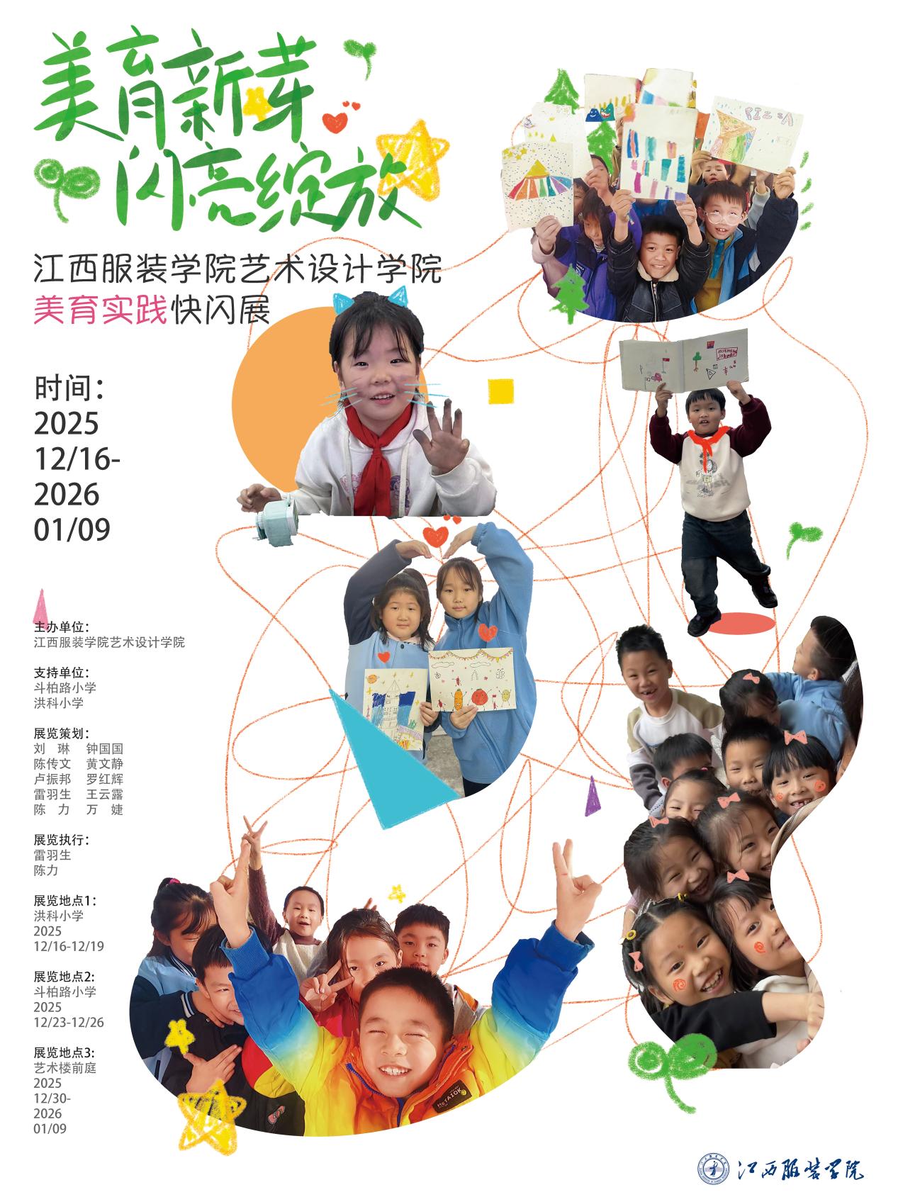 新闻中心讯(素材供稿/艺术设计学院)近日,由江西服装学院主办、江西服装学院艺术设计学院、洪科小学与斗柏路小学协办的“美育新芽闪亮绽放”美育实践巡回展,江西服装学院收官展正在艺术楼前厅展览。这场历时半个月、跨越高校与基础教育校园的巡回展,以洪科小学首展、斗柏路小学巡展、江西服装学院收官展的三站联动模式,系统呈现了江西服装学院校地美育共建成果,更以美育为纽带,为大中小学思政课一体化建设探索了实践新路径。