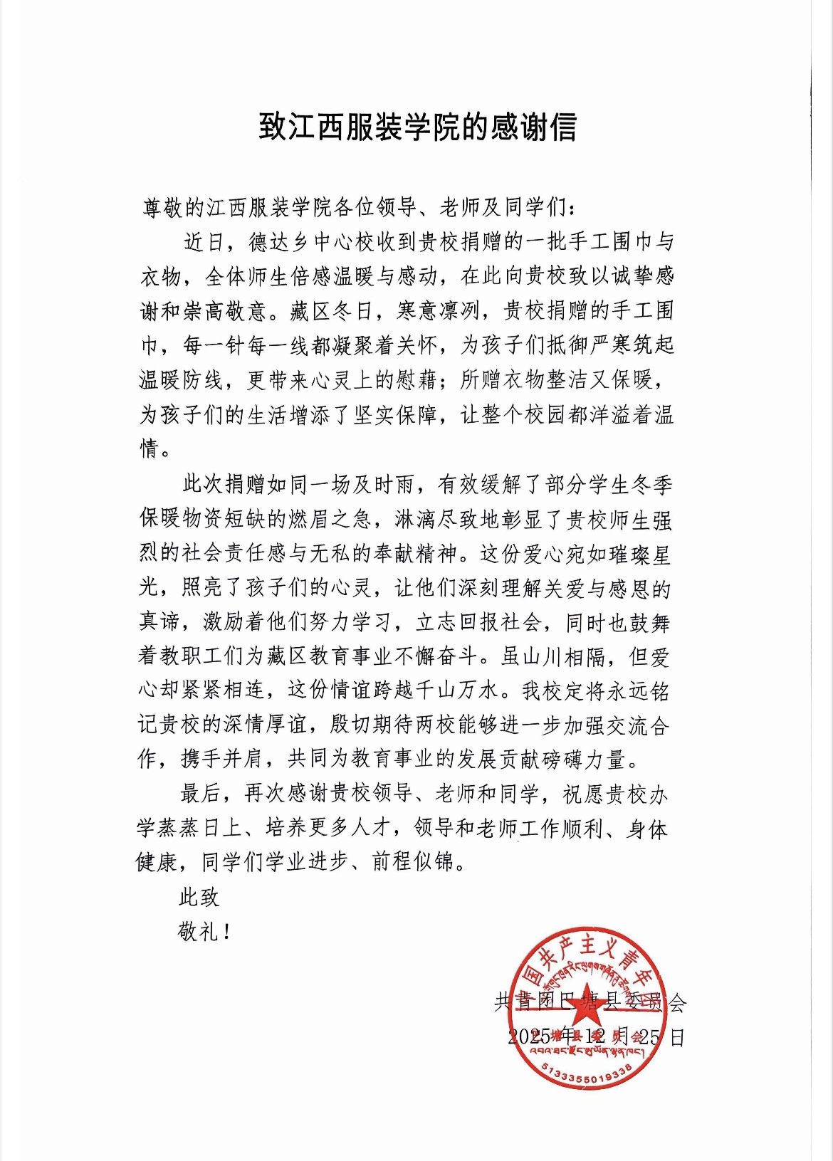 新闻中心讯(供稿/服装设计学院 蓝岚 王袭)冬日暖阳升,爱心逐风来。近日,一封来自四川甘孜藏族自治州巴塘县德达乡中心校的感谢信,跨越千山万水抵达江西服装学院,字里行间满含高原小朋友的真挚谢意,为这场跨越2000余公里的爱心接力画上了温暖的句号。