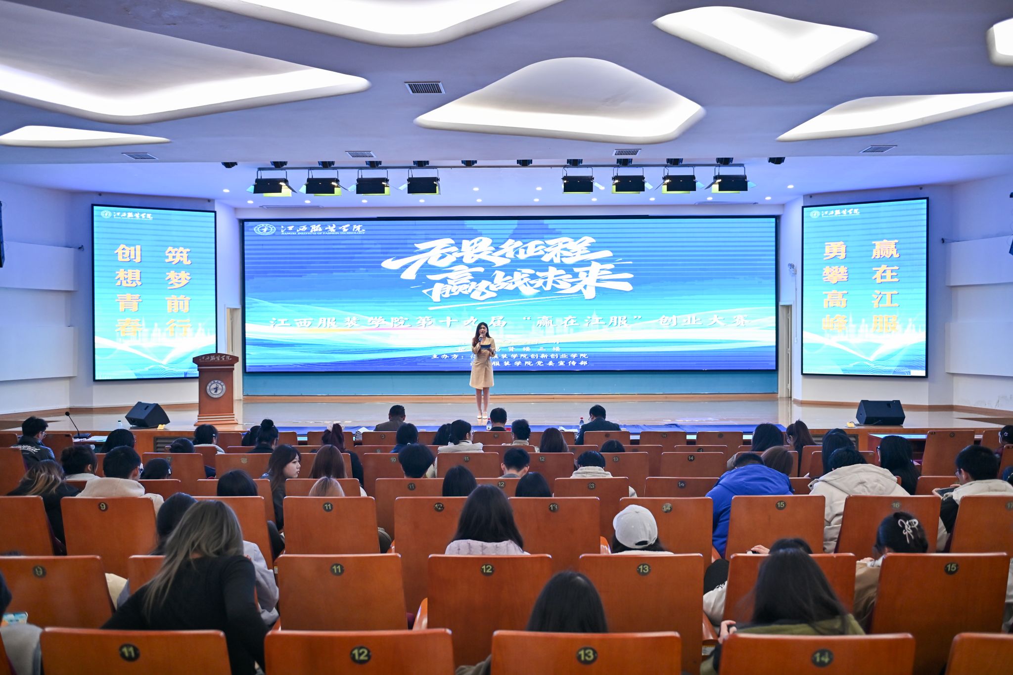 新闻中心讯(供稿/创新创业学院)为深入贯彻落实党的二十大对新时代创新创业工作的新要求,锤炼大学生创新创业本领,展示学校创新创业教育成果,3月10日下午,江西服装学院第十九届“赢在江服”创业大赛成功举办。副校长马国照,创新创业学院院长段婷、副院长万萍及各学院赛事负责人莅临现场,大赛还邀请到张记刚、黄德昌、刘清华三位行业资深教授担任评委,全校师生共同见证这场充满创意与活力的创业盛宴。