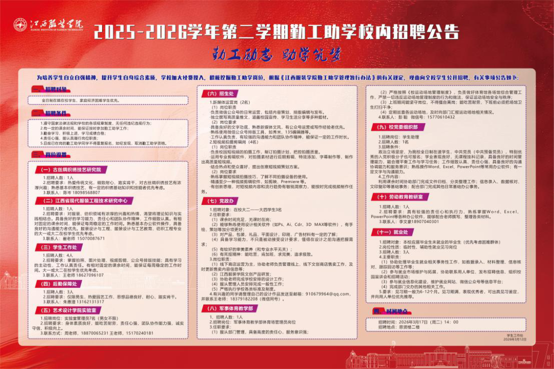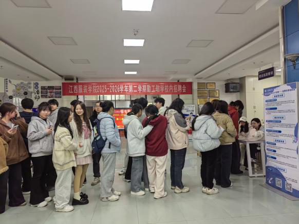 新闻中心讯(供稿/学工处)为深入推进资助育人工作,培养学生自立自强、艰苦奋斗的精神品格,江西服装学院2025-2026学年第二学期勤工助学校内岗位招聘会于3月17日在思贤楼二楼顺利召开。本次招聘会以“勤工励志,助学筑梦”为主题,面向全校学生开放涵盖行政辅助、技艺传承、创意设计、公共服务等多类优质岗位,为学子搭建实践锻炼、提升能力、实现价值的成长平台。