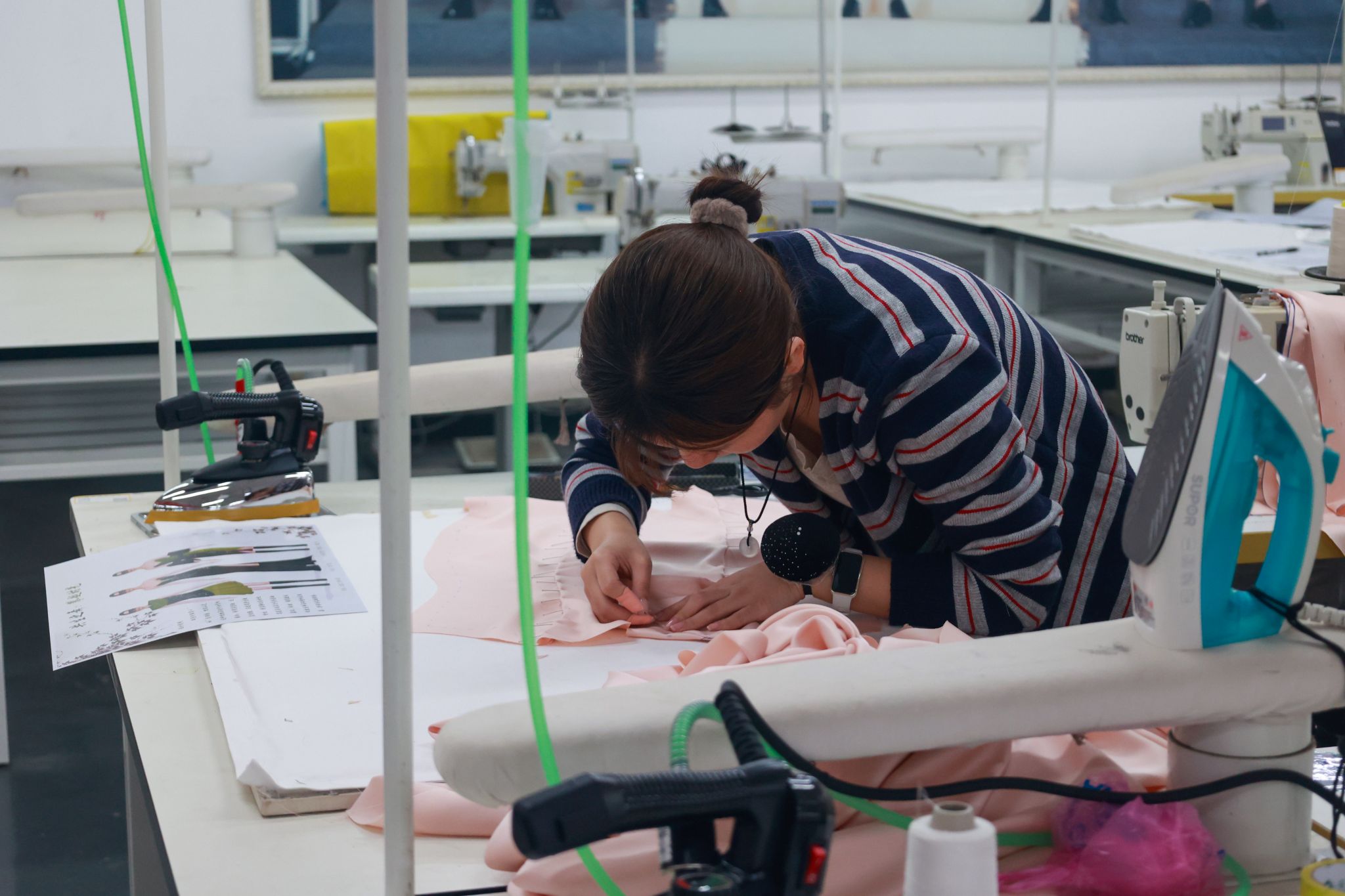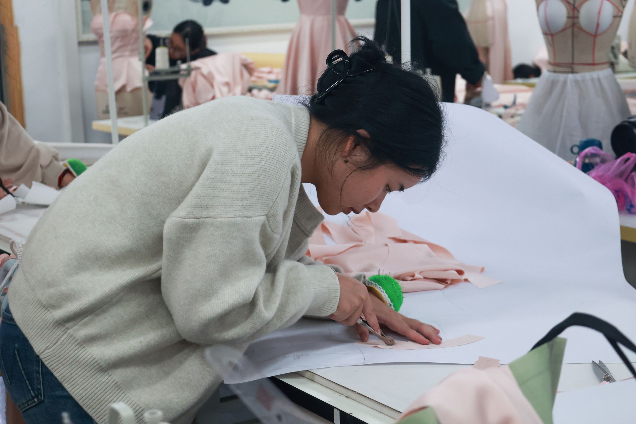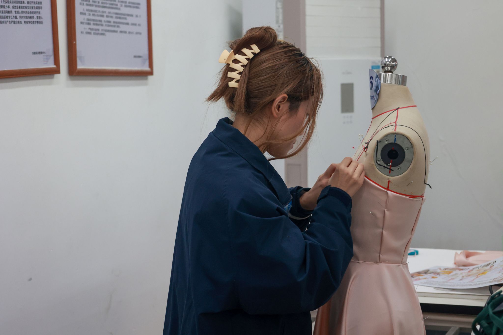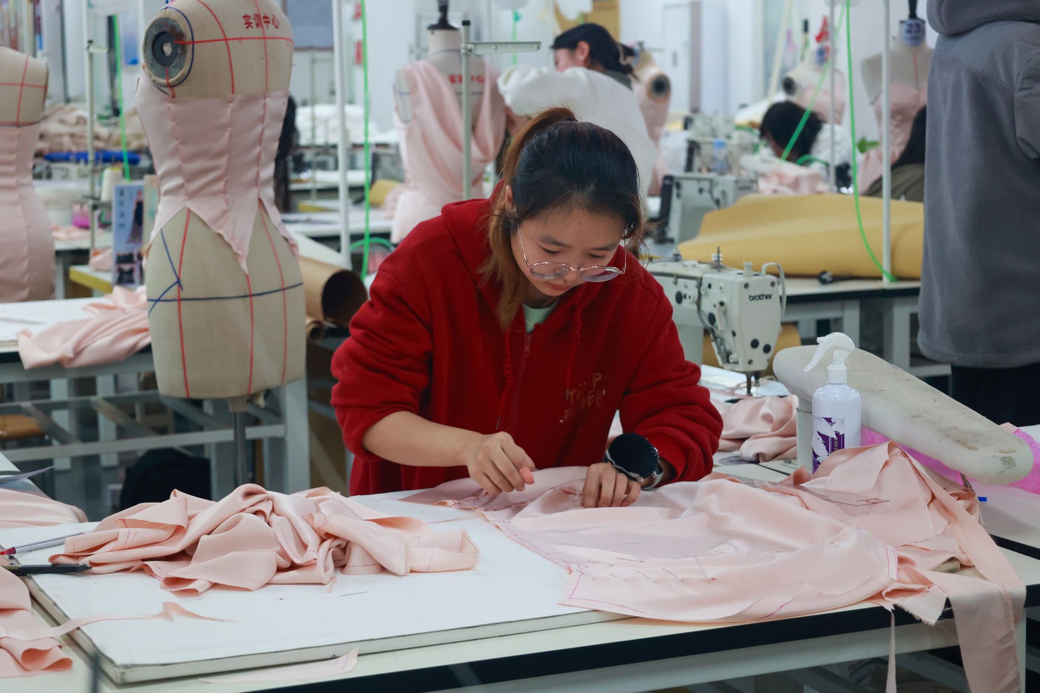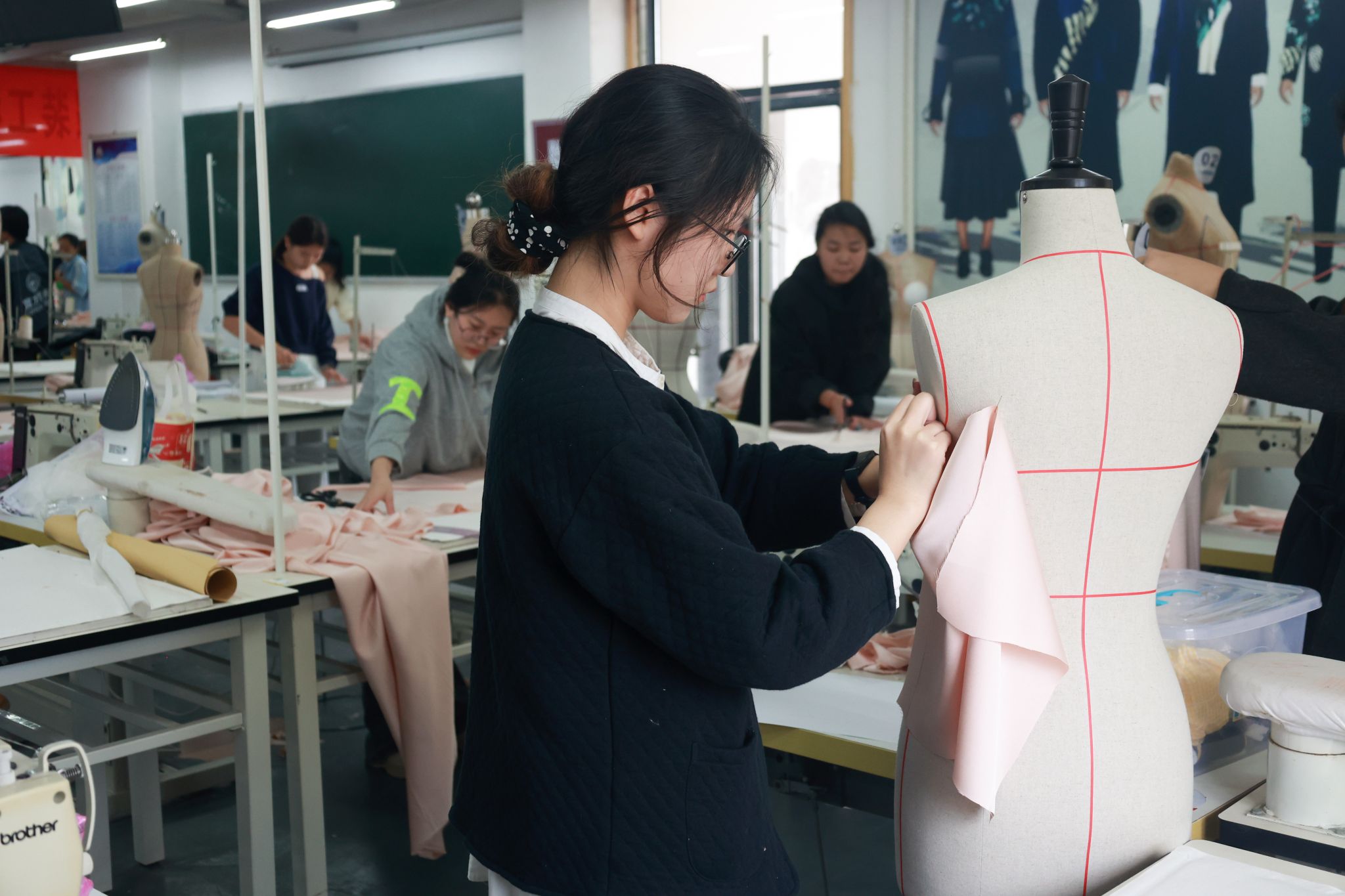 据了解,本次决赛在初赛基础上升级竞技难度,要求选手从初赛提交的以“和”为主题的3套3D建模作品中任选1套,在规定时间内完成从“虚拟建模”到“实体成衣”的全流程转化。比赛现场,选手们熟练运用剪刀、皮尺等工具,专注进行面料处理、精准裁剪与细致缝合,将数字模型中的流畅线条、立体结构逐一转化为可触可感的服装作品,既展现了扎实的传统手工技艺,更凸显了“虚拟设计→实体落地”的综合实践能力,赢得现场观赛师生的阵阵好评。