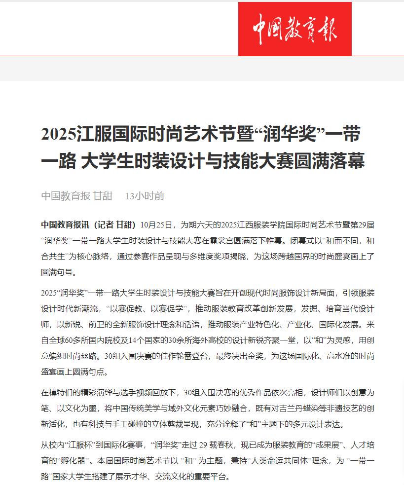 中国教育报:2025江服国际时尚艺术节暨“润华奖”一带一路 大学生时装设计与技能大赛圆满落幕