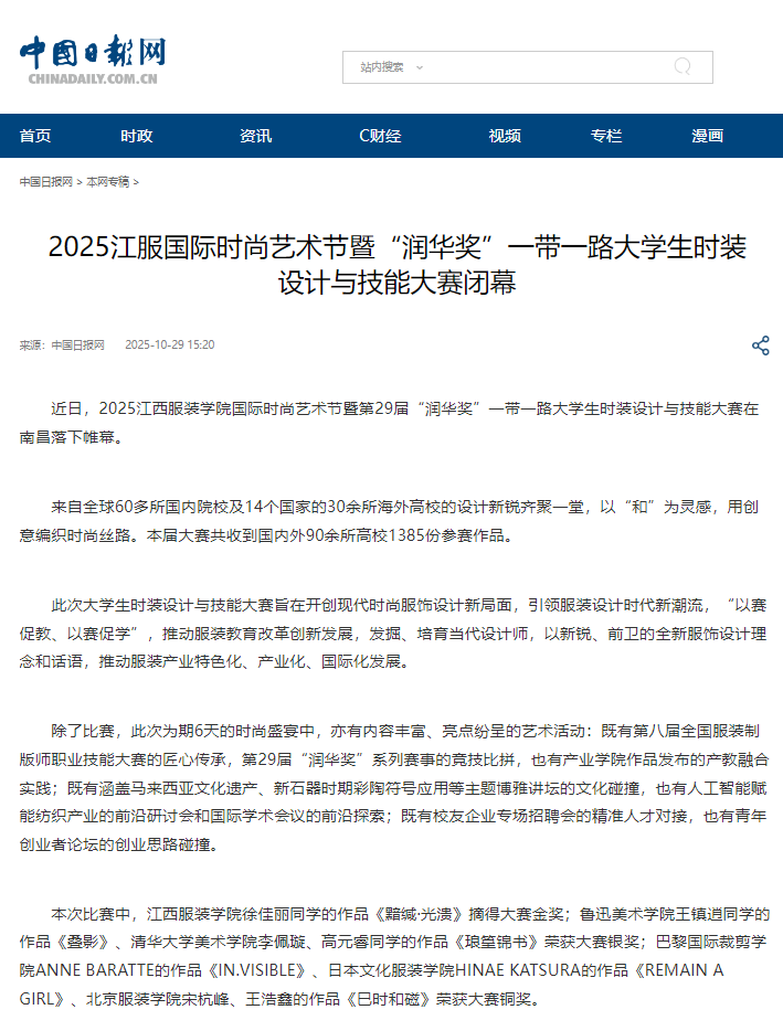 中国日报:2025江服国际时尚艺术节暨“润华奖”一带一路大学生时装设计与技能大赛闭幕