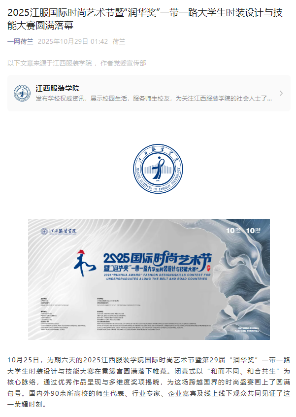 一网荷兰:2025江服国际时尚艺术节暨“润华奖”一带一路大学生时装设计与技能大赛圆满落幕