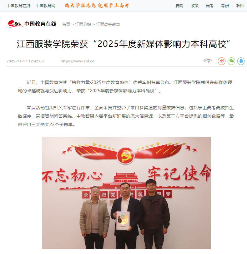 原文链接:中国教育在线:江西服装学院荣获“2025年度新媒体影响力本科高校”