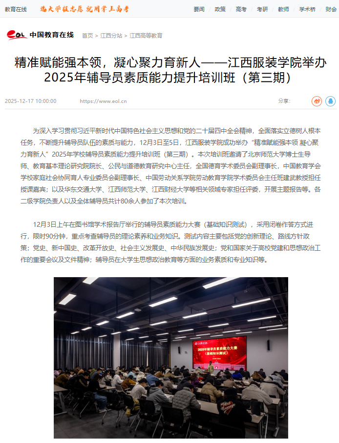 中国教育在线:精准赋能强本领,凝心聚力育新人——江西服装学院举办2025年辅导员素质能力提升培训班(第三期)