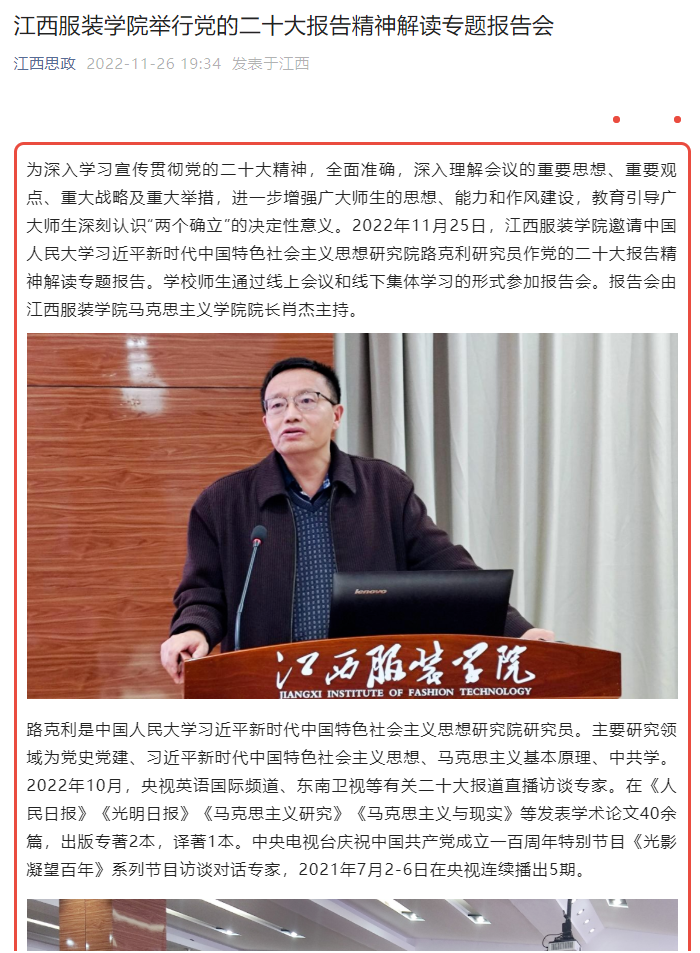 江西思政:江西服装学院举行党的二十大报告精神解读专题报告会