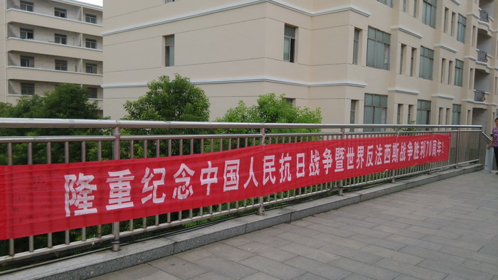 “铭记历史、缅怀先烈、珍爱和平、开创未来”十六个字印在横幅上挂在江服主教楼的醒目位置,无论何时何地,每一个江服人都应牢记历史,不忘初心,为实现中华民族的伟大复兴,把满腔爱国之情化为发愤学习之动力,热忱报国之行动。