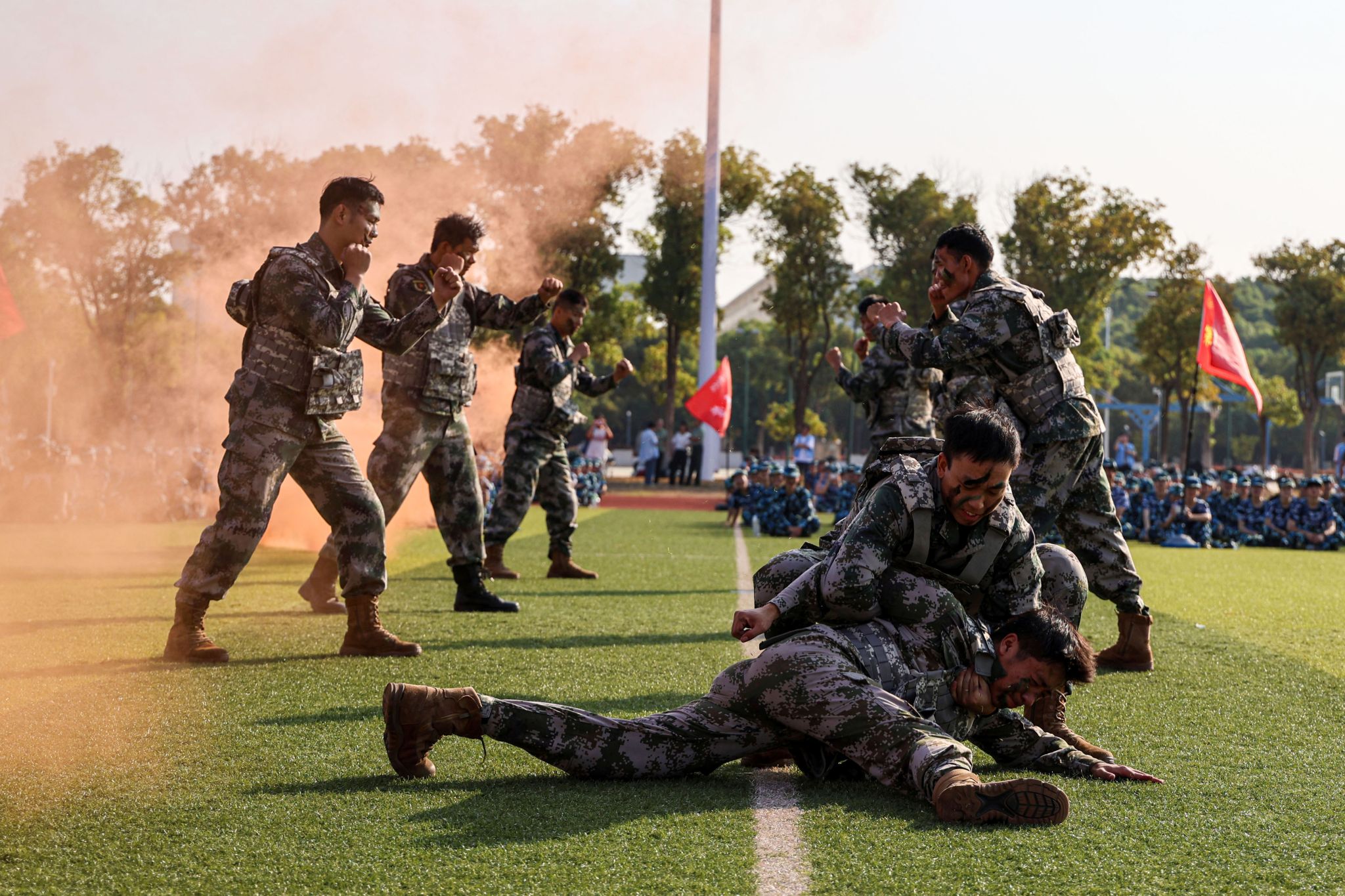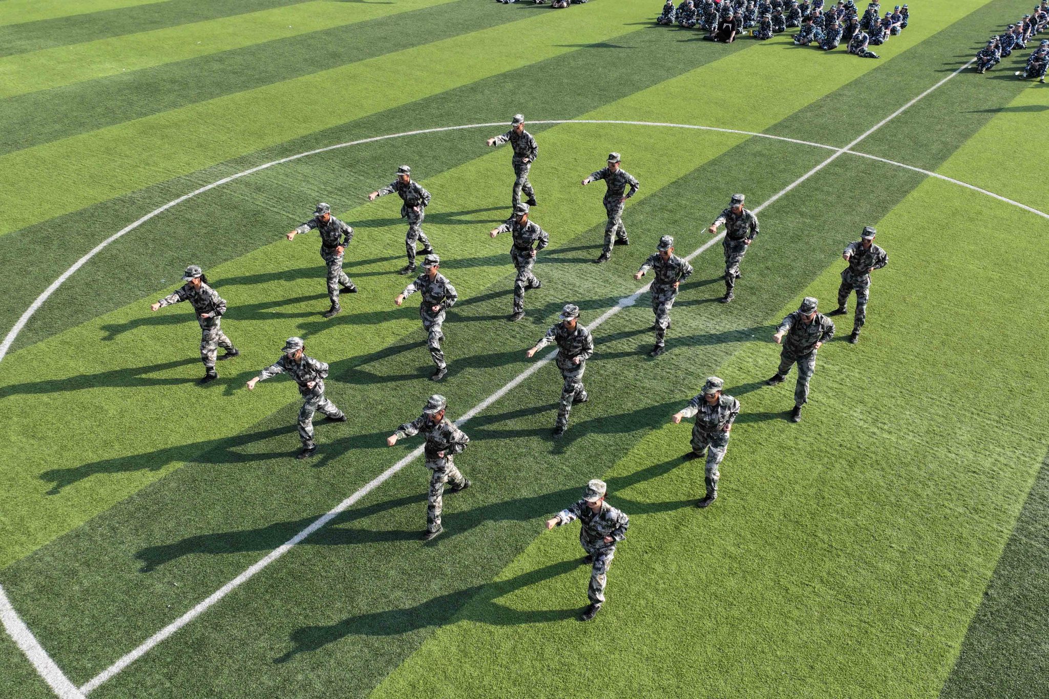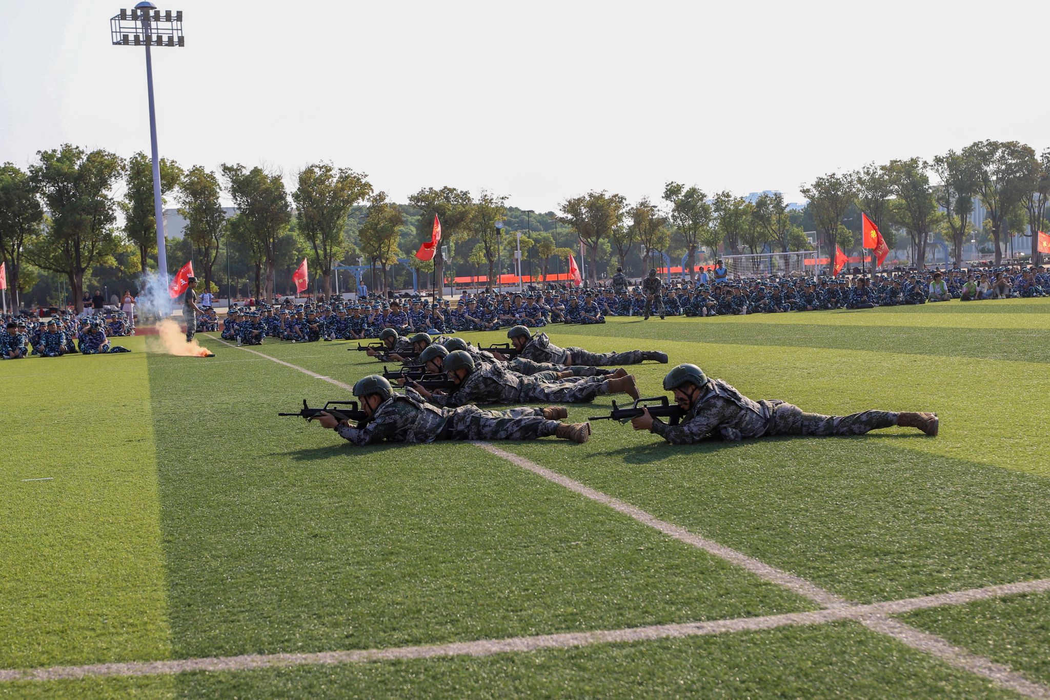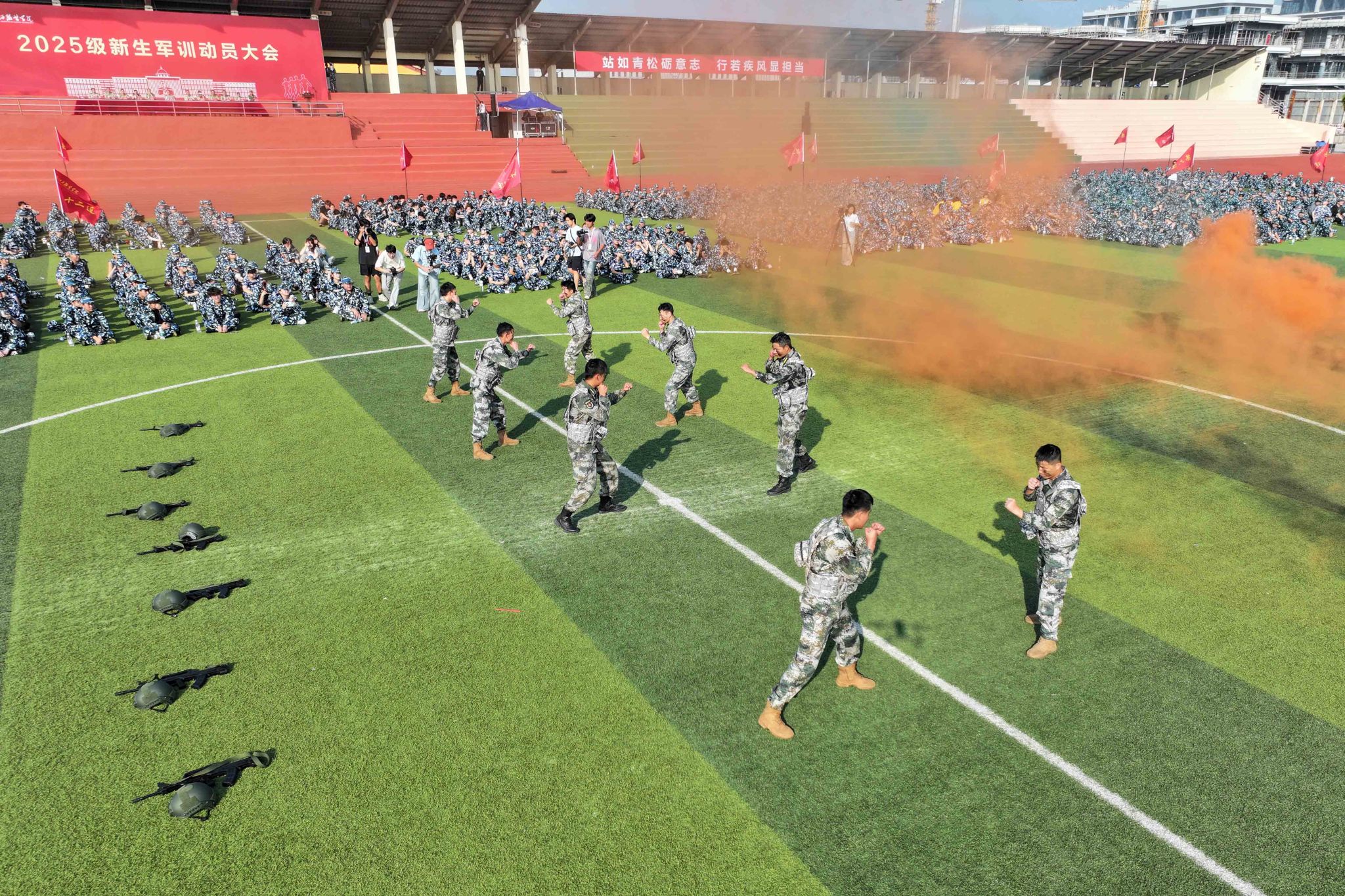 动员大会第二阶段,全体师生观摩了教官们的军训技能示范演示。队列训练中,教官们动作标准、整齐划一,展现出严整的军容与过硬的作风;擒敌拳演示手脚并用、摔擒合一,尽显军人的勇猛与干练;战术演练中,教官们灵活运用战术动作,展现了战场生存与战斗能力,诠释了军人的勇敢与专业,赢得现场新生阵阵掌声。