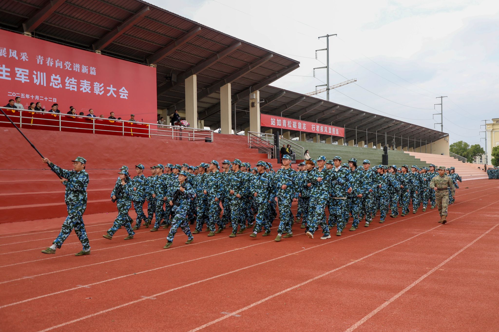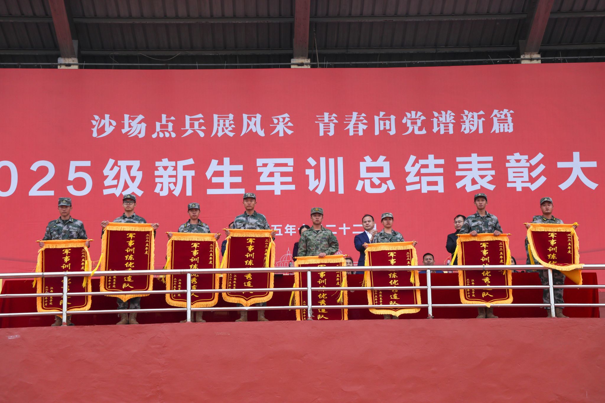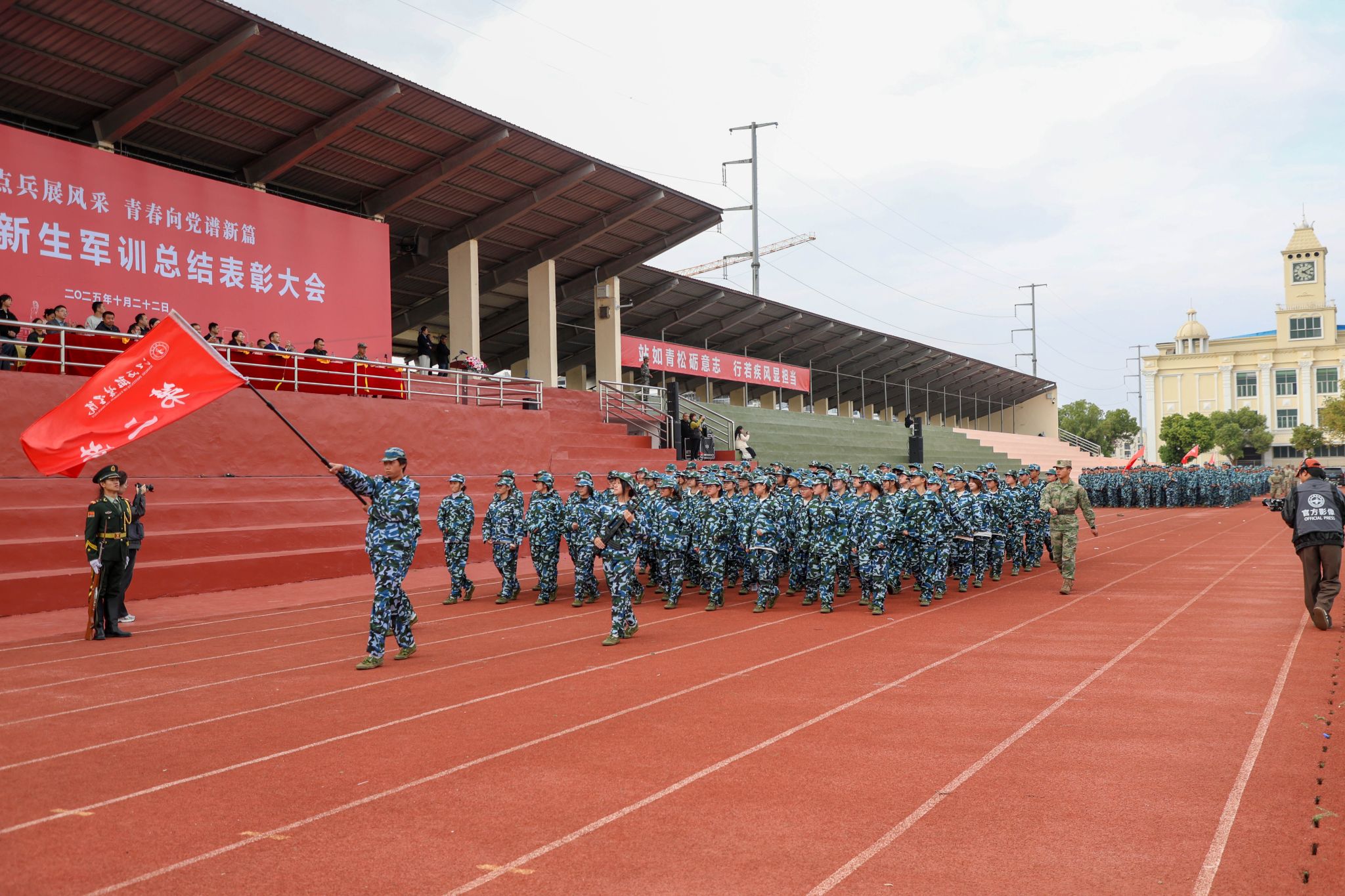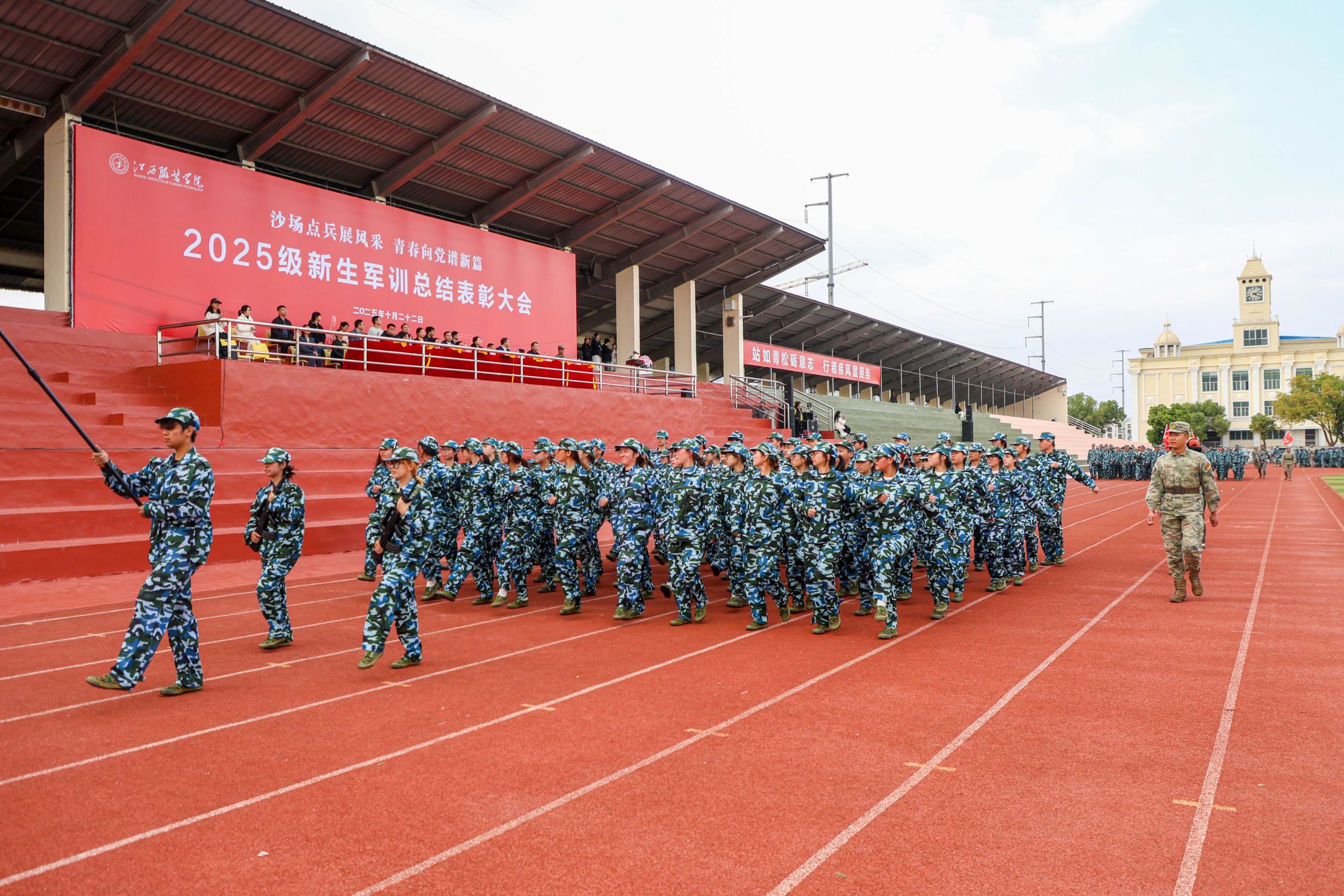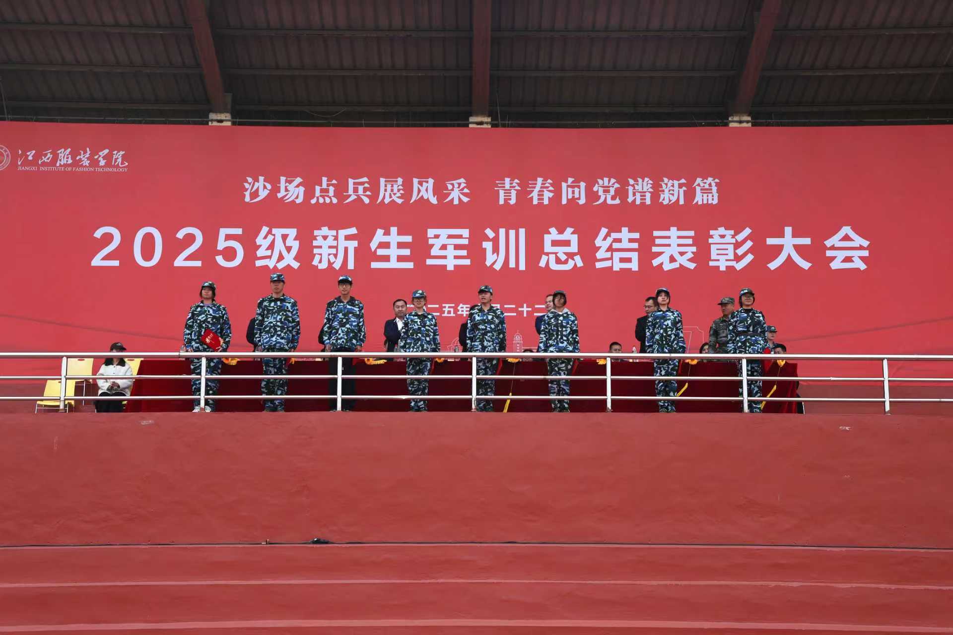 新闻中心讯(文/樊翔 图/万强 丁鹏 钟宏鹏 颜冲 梅涛 古明希 刘毅 陈浩天)秋意渐浓日,迷彩练兵时。10月22日下午,江西服装学院2025级新生军训总结表彰大会在田径场举行。校党委书记林井萍、党委副书记唐新强出席大会,党委宣传部、学工处、教务处、团委、武装部等职能部门负责人,各学院党委(总支)书记(副书记)、学工办主任、新生辅导员、全体军训教官、2025级全体新生参加了大会。大会由人民武装部部长鲍鹏主持。