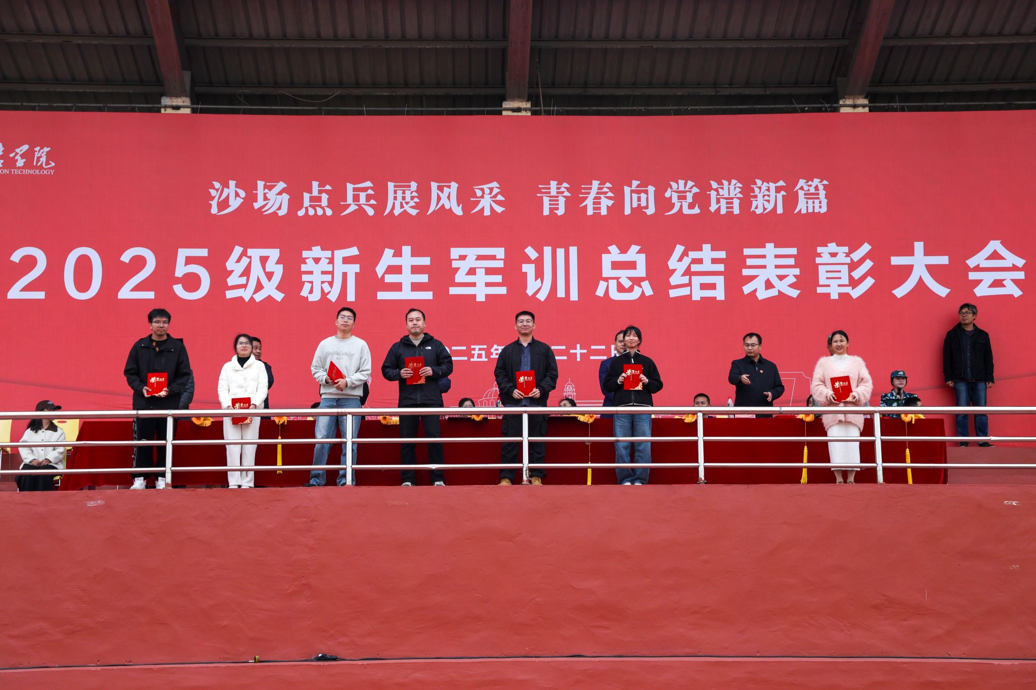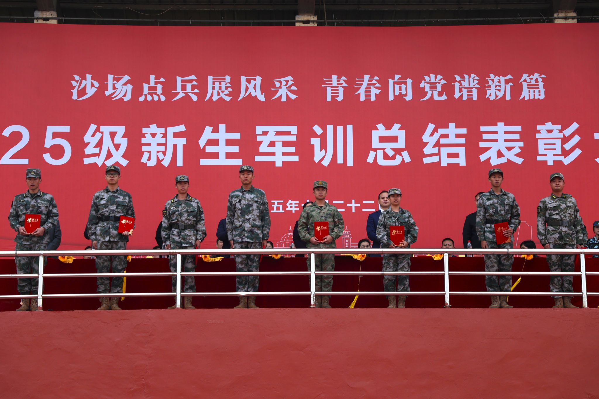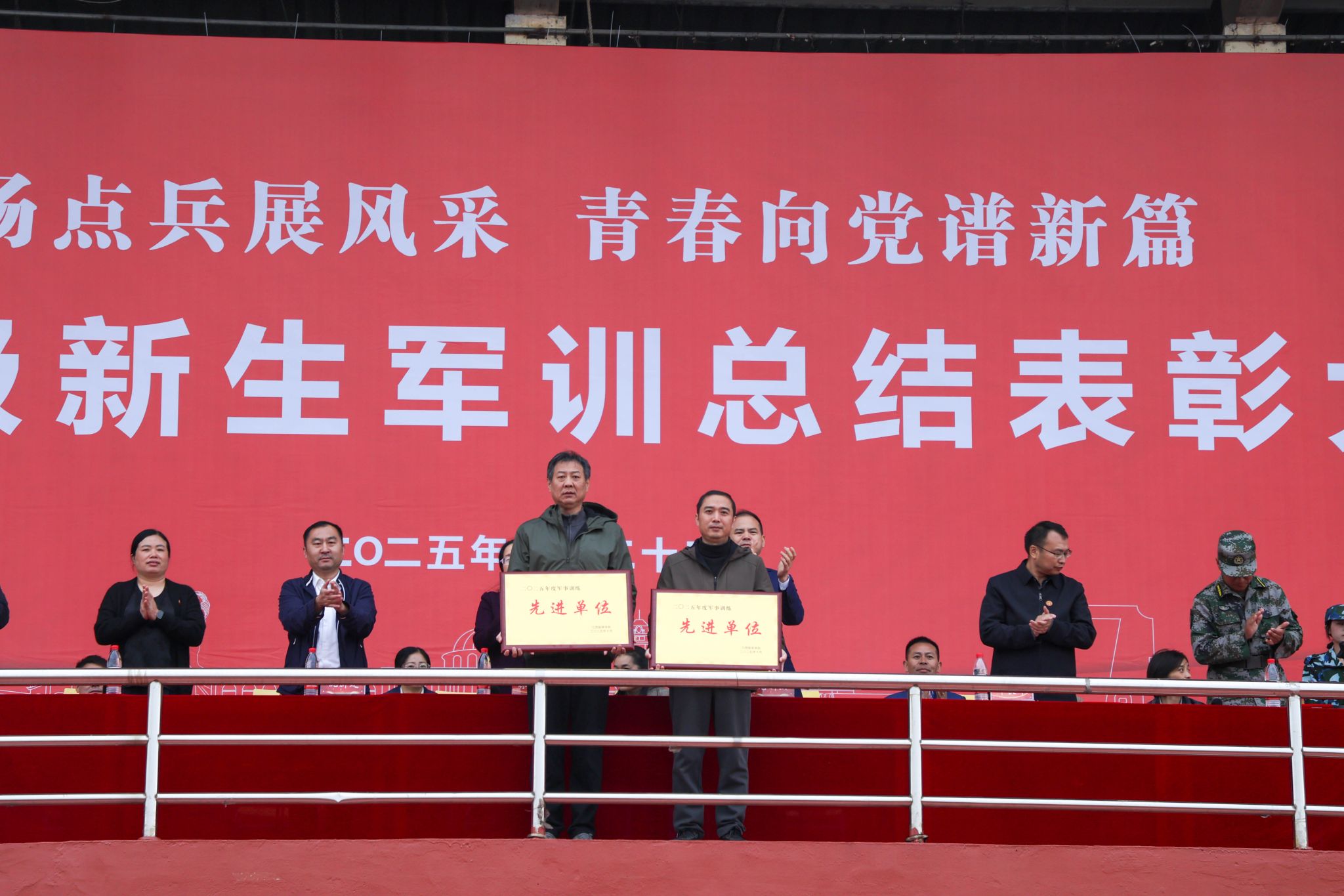 学工处处长邓良峰宣读《关于表彰2025级军训工作“优秀连队”“优秀教官”“优秀辅导员”“优秀标兵”的决定》。本次大会共表彰军训优秀连队12支,军训优秀教官11名,军训优秀辅导员10名,军训标兵839名,新生军训工作先进单位2个。随后,校领导为获奖单位及学生代表颁奖。