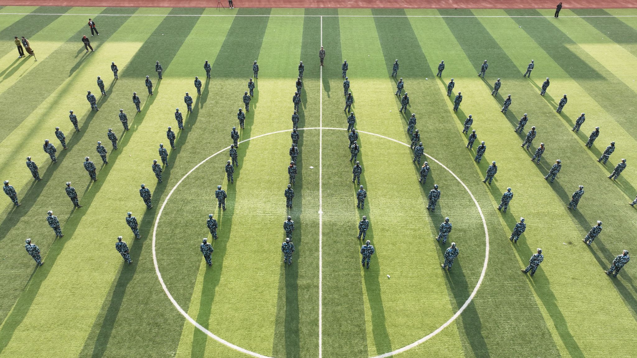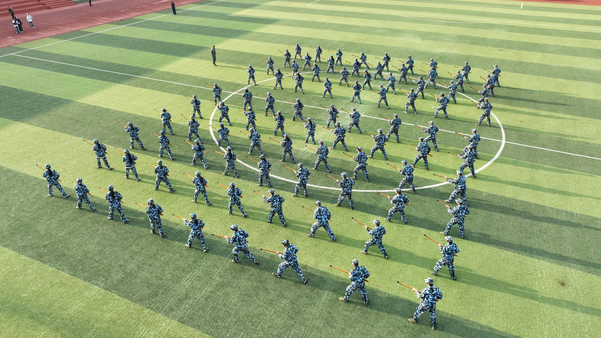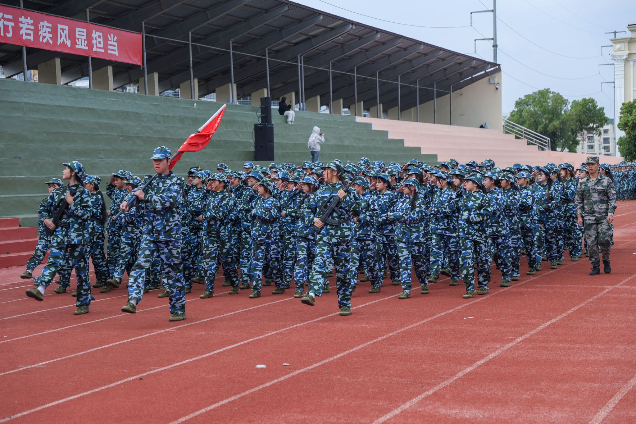 军训汇报表演开始,擒敌操方块阵出招迅速、攻防兼备,动作刚柔并济,一招一式有来有往;匕首操方块阵动作干脆利落,一套出鞘、弓步、上刺、侧刺等连招势如破竹;刺杀操方块阵步伐一致,动作干净利落,随指挥员一声令下,吼声如雷贯耳,震人心魄。随后开展的军事技能汇演精彩纷呈。擒敌拳刚劲有力,刺杀操杀气凛凛,匕首术英姿飒爽、高水平的战术军事项目表演将现场气氛推向高潮,田径场上掌声雷动,喝彩不断。