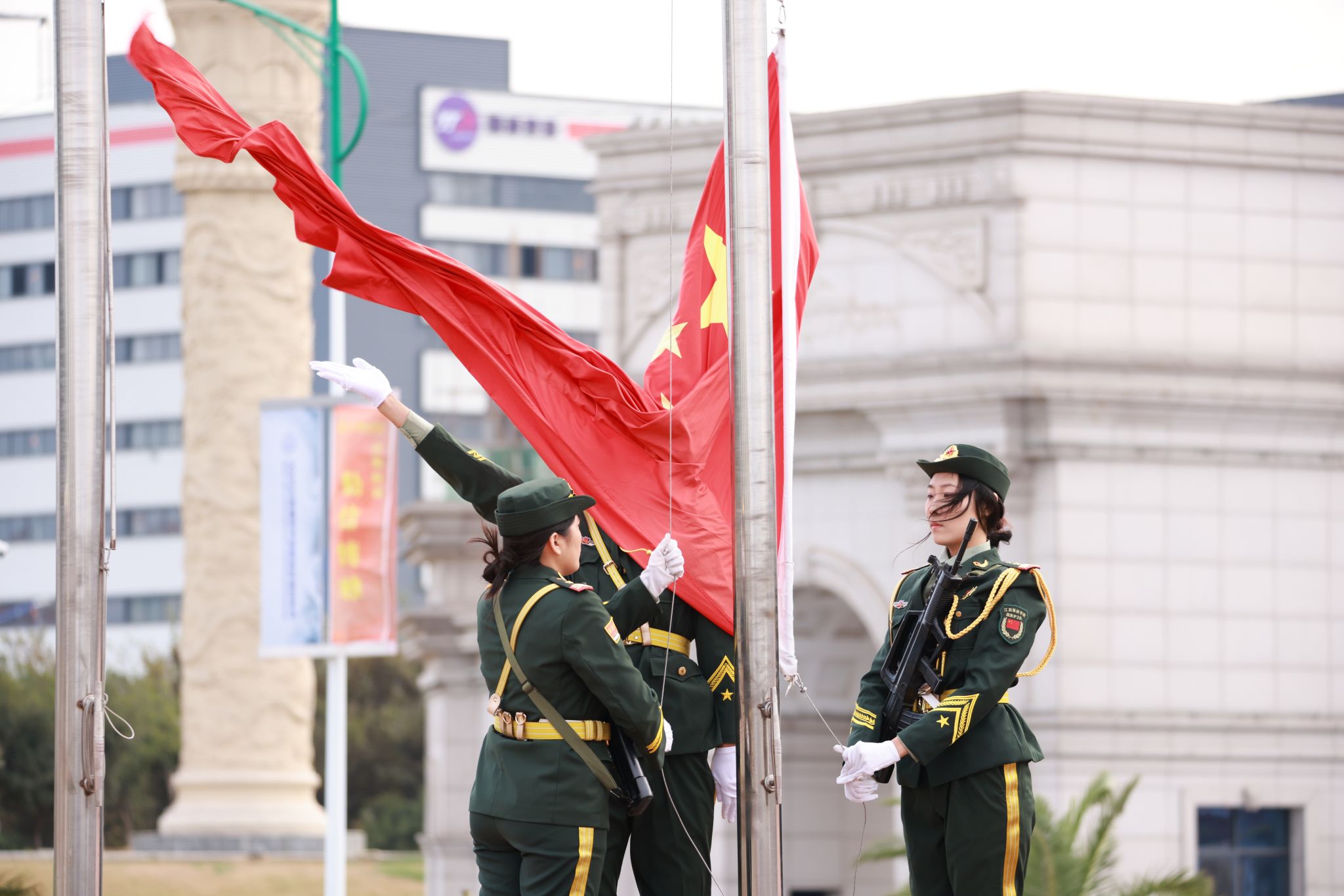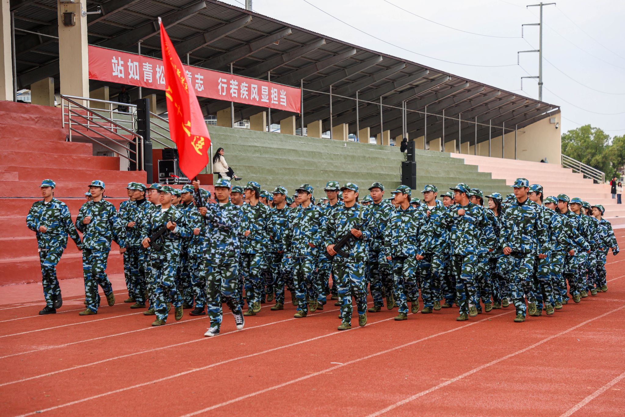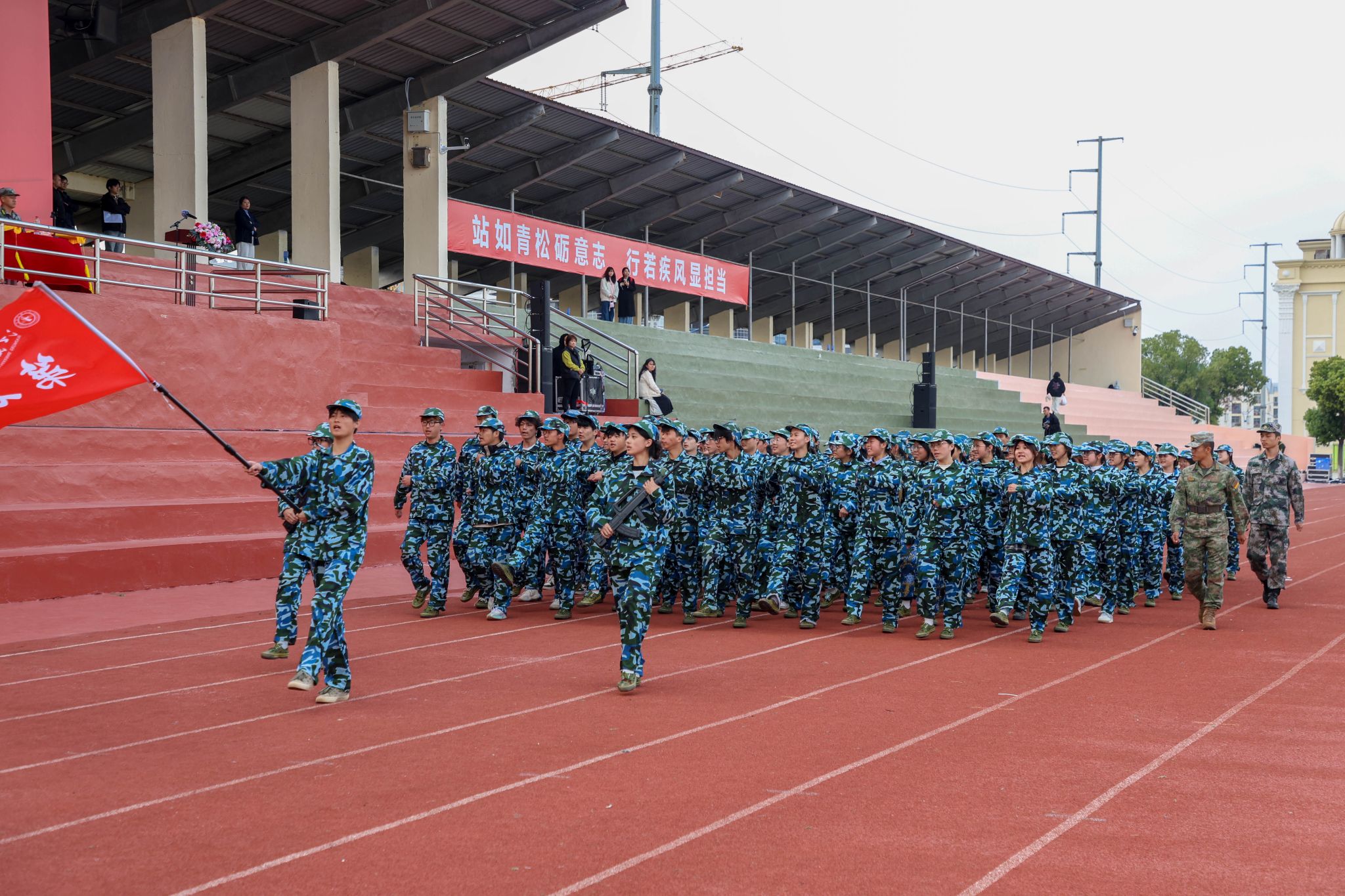 升旗仪式后,分列式表演正式拉开帷幕,各营方阵迈着铿锵步伐通过主席台,声声宏亮的口号彰显着江服学子牢记使命、奋发有为的坚定决心。