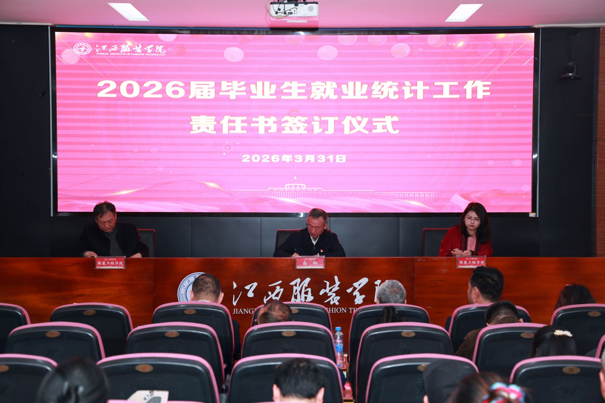 会议现场还举行了签约仪式。执行校长尚钢与各二级学院党政负责人共同签订《江西服装学院2026届毕业生就业统计工作责任书》。一纸责任书,不仅是郑重的签字确认,更是学校压紧压实就业工作责任、构建“党政同责、一岗双责、齐抓共管”就业工作格局的关键举措,充分彰显了以制度刚性护航就业工作落地见效、全力保障2026届毕业生高质量就业的坚定决心。
