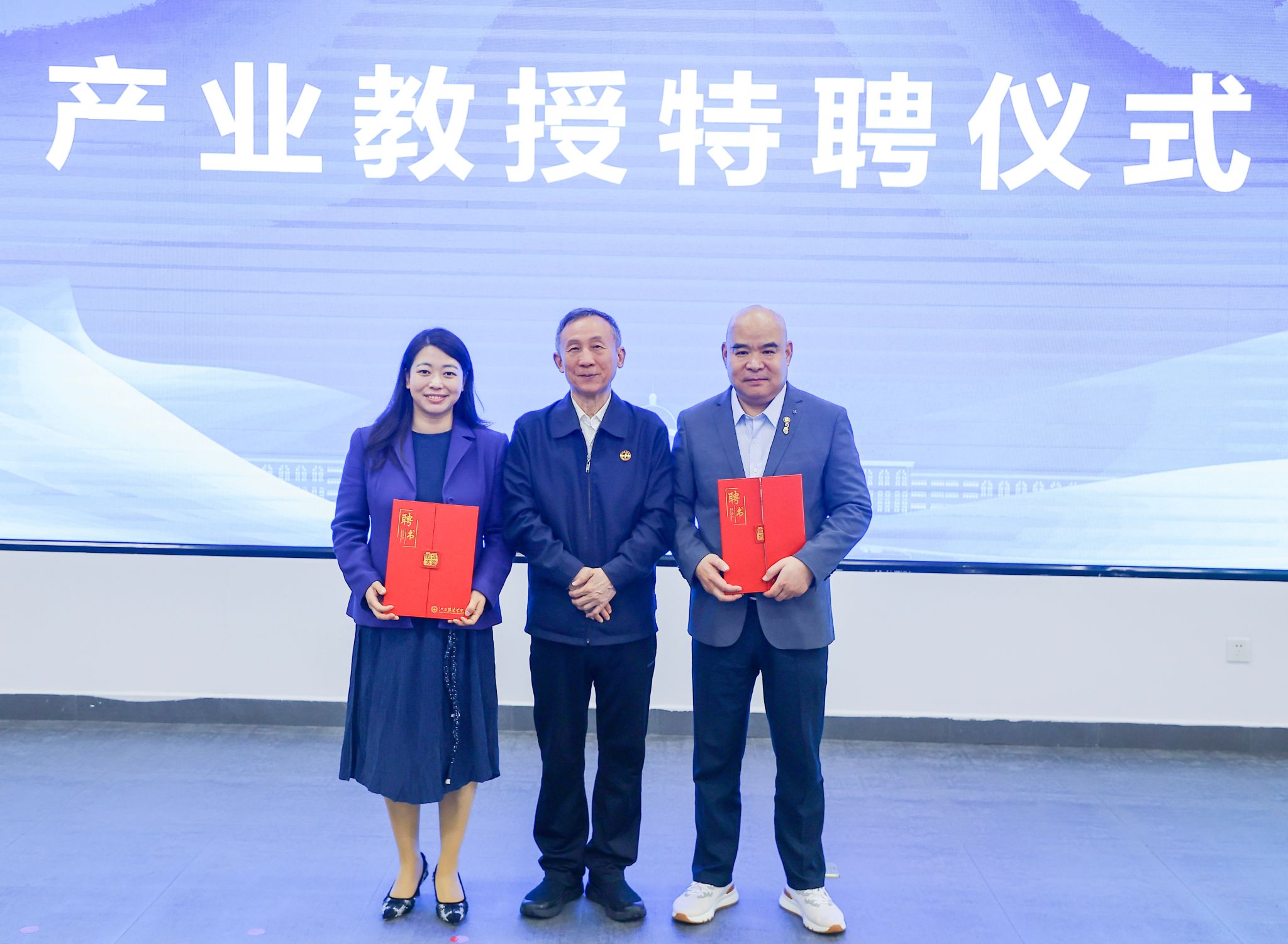 学校执行校长尚钢(中)为秀水街董事长张永平(右)、总裁董青(左)颁发江西服装学院产业教授聘书
