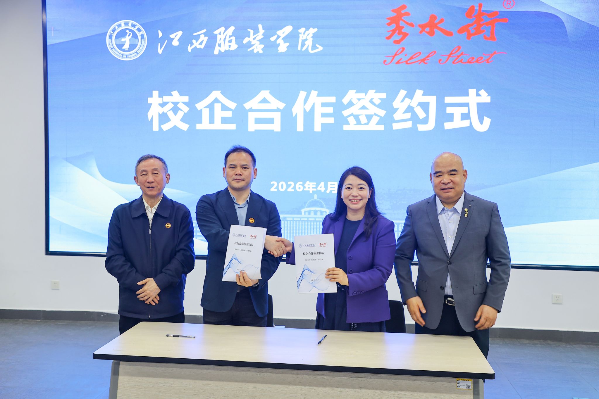 学校党委副书记唐新强(左二)、秀水街总裁董青(右二)分别代表校企双方签署《校企合作框架协议》