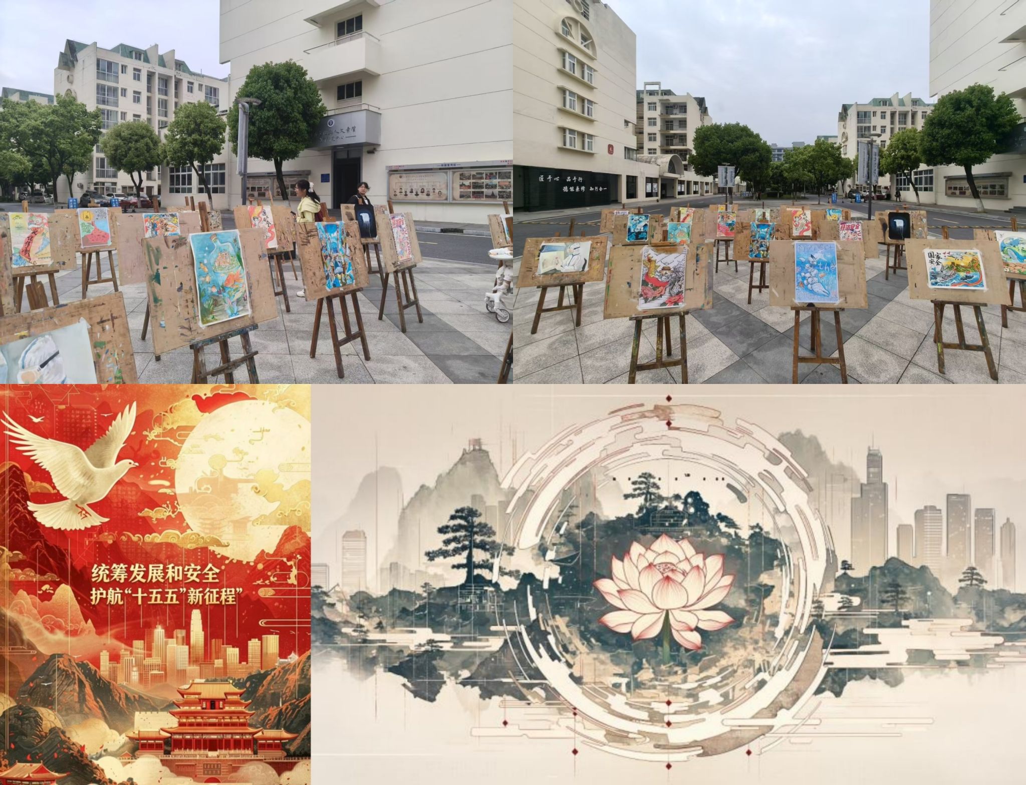 服装设计学院、艺术设计学院立足艺术专业优势,将国家安全理念与艺术创作深度融合,打造特色育人载体。服装设计学院开展国家安全主题作品征集及展示活动,引导学子发挥专业所长,以创意设计、手工创作等形式,诠释国家安全内涵,践行安全责任;艺术设计学院在艺术楼前举办国家安全主题画展,展出国画、油画、海报设计、版画等多种形式作品,通过天安门、火箭、医护人员等经典形象,生动传递家国情怀与安全理念,让师生在艺术熏陶中深化对总体国家安全观的理解。
