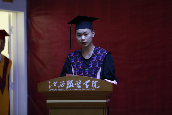 服装设计与管理分院2011级服设本科1班的毕业生郑建文同学代表全体毕业生发言。他满怀深情地回顾了大学四年的学习、生活。他说,经历了大学四年的紧张和忙碌,我此刻的心情和在座的各位同窗一样,纵然喜悦,也掩不住回忆与留恋。面对母校,即将毕业的我们感慨万千。正是由于师长们的培养,使我们在发展方向上拥有充分的个性空间;正是由于师长们的关怀,使我们可以自信地面对任何艰难困苦;正是由于师长们的呵护,才使得我们顺利完成学业。感谢亲爱的母校,是您包容了我们的懵懂无知,是您给了我们展示自我的舞台。让我们不仅学到了知识,而且学会了怎样做人,这是母校给予我们的最宝贵财富。感谢亲爱的老师,是您的辛劳付出,换来了我们的收获与成长。