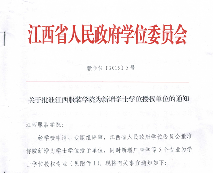 近日,从江西省人民政府获悉,省学位委员会下发了《关于批准江西服装学院为新增学士学位授权单位的通知》(赣学位[2015]5号),批准我校新增为学士学位授予单位,同时,批准新增服装设计与工程、广告学、表演、市场营销、环境设计等5个本科专业为学士学位授权专业,从今年开始启动学士学位授予工作。