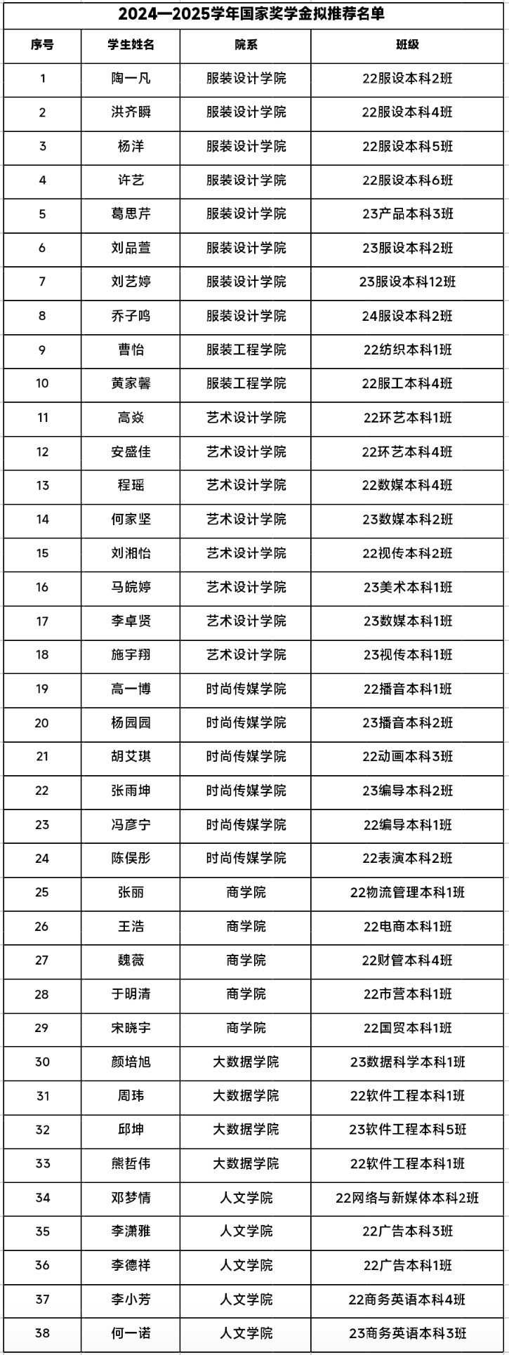 为进一步规范我校国家奖学金评选工作,根据上级文件精神,本着公平、公正、公开、原则,经个人申请、班级推荐、学院奖助学金评定委员会初评、学校奖助学金评审委员会复审,初步拟定2024-2025学年国家奖学金推荐名单,现将名单公示如下: