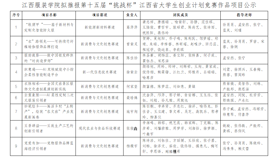 江西服装学院拟推报第十五届“挑战杯”江西省大学生创业计划竞赛作品项目公示