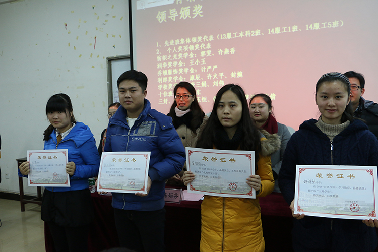 大会对韩园等2位“国家奖学金”获得者、叶茜等58位“国家励志奖学金”获得者、“纺织之光奖学金”获得者余学德、黄梦婷等8位企业奖学金获得者、13服饰本科2班等4个“先进班集体”、任兵兵等2位“十佳班长”以及韩园等47名“优秀学生干部”进行了表彰奖励。