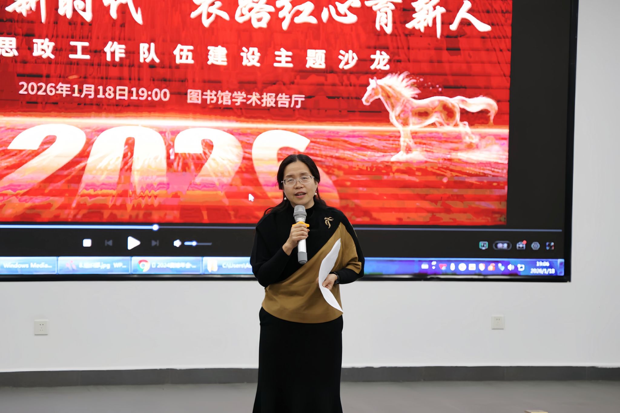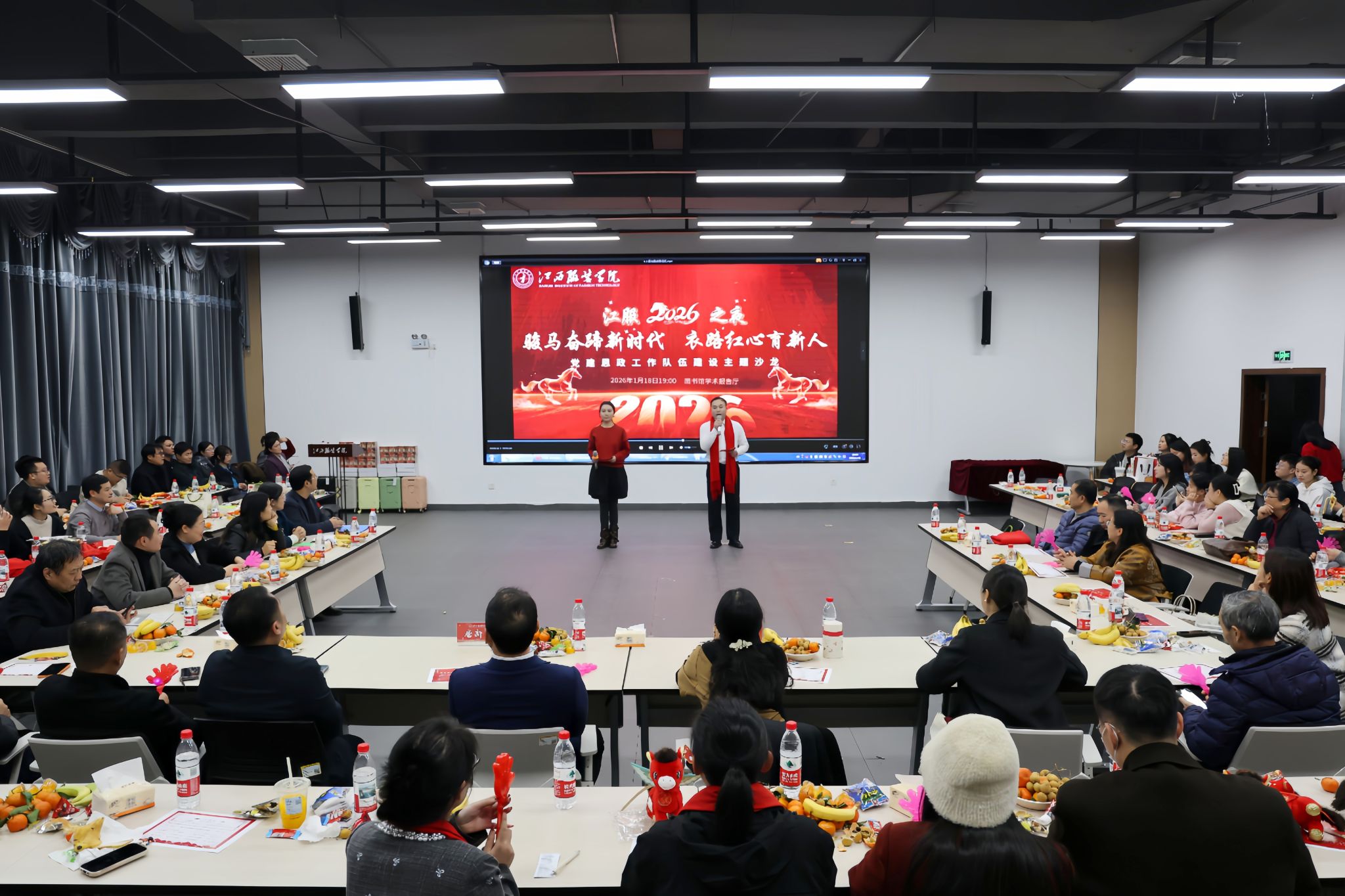 新闻中心讯(供稿/党委学生部)骏马奋蹄新时代,衣路红心育新人。为进一步凝聚党建思政工作队伍合力,锤炼队伍向心力与战斗力,展现全校思政工作者昂扬向上的精神风貌,营造团结奋进、温馨和谐的校园文化氛围,激励广大思政工作者以饱满热情深耕立德树人主阵地。1月18日晚,江西服装学院2026“骏马奋蹄新时代,衣路红心育新人”党建思政工作队伍建设主题沙龙在图书馆三楼报告厅成功举行。校党委书记、督导专员林井萍,党委副书记唐新强出席活动,党委组织部、党委宣传部、党委统战部、党委学生工作部、校团委及各二级学院思政工作队伍全体成员齐聚一堂,共话育人初心,共展队伍风采,共绘思政工作新蓝图。