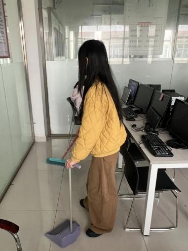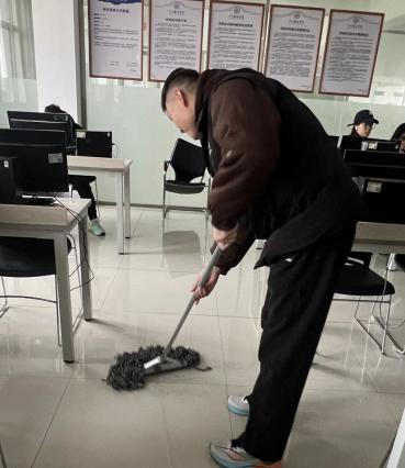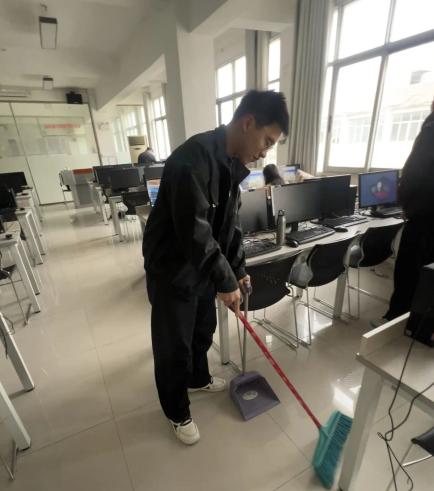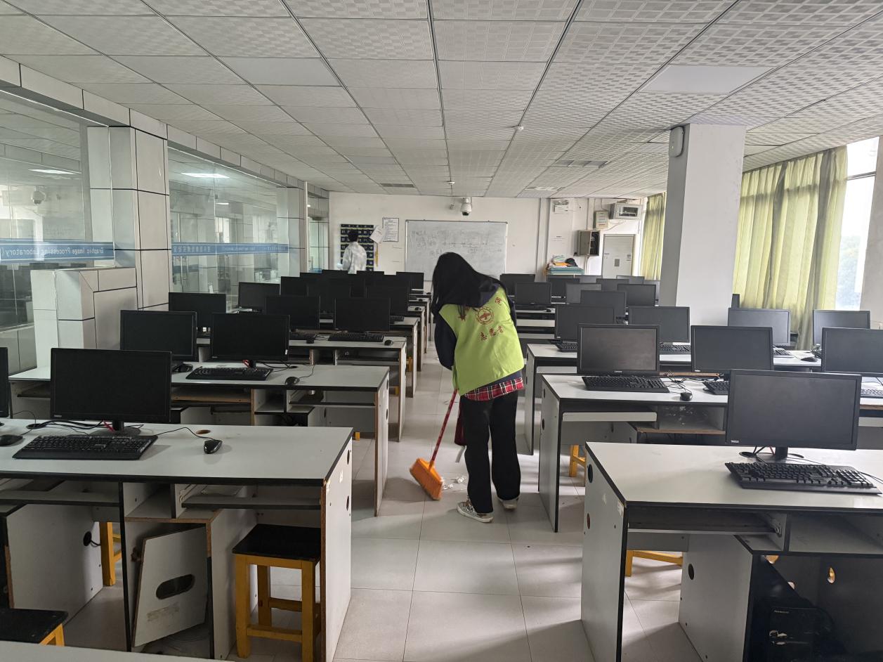商学院学生在信息实验中心开展“学习雷锋精神,营造优良学风”环境清扫活动,同学们俯身擦拭设备、整理线缆、清扫垃圾,用最朴实的劳动践行“不怕脏、不怕累”的奉献精神。