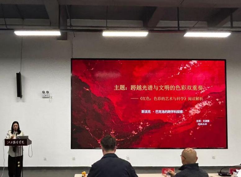 核心分享环节精彩纷呈,文淑丽博士以《跨越光谱与文明的色彩双重奏》为主题,围绕英国剑桥大学资深研究员斯派克・巴克洛的《红色:色彩的艺术与科学》展开深度分享。文淑丽博士从书籍概况、内容结构、跨学科视角、学术价值等多个维度,系统解析了红色的科学属性与文化艺术表达的内在关联,梳理了红色从天然颜料提取到人工合成的技术演进史,剖析了其在自然现象、文化符号、艺术史与现代设计中的多重内涵。她还结合江西地域文化特色,挖掘了瓷都祭红、龙虎山丹霞红、客家剪纸大红等本土色彩艺术的独特魅力,并将书中理念与尚钢校长《江服之美随想曲》相呼应,探讨了色彩美学在服装设计教学中的实践路径,为在场教师解锁了服饰色彩教学的新方法、新思路,其跨学科的研究视角和贴合本土的教学思考赢得阵阵掌声。