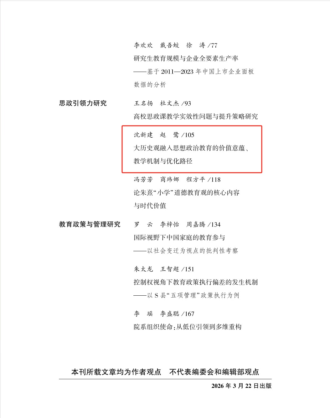 近日,CSSCI来源期刊(扩展版)《中国人民大学教育学刊》2026年第2期正式出版,我校沈新建博士作为第一作者撰写的学术论文《大历史观融入思想政治教育的价值意蕴、教学机制与优化路径》在该刊思政引领力研究栏目刊发,标志着学校在思想政治教育理论研究领域取得新突破。