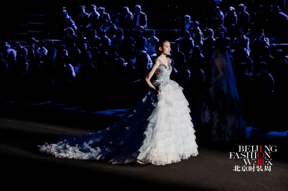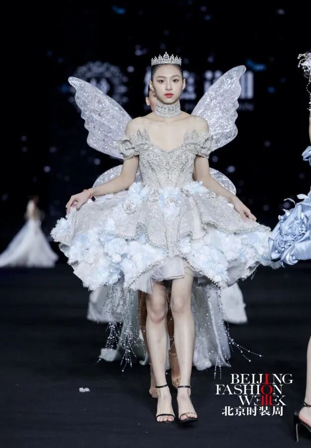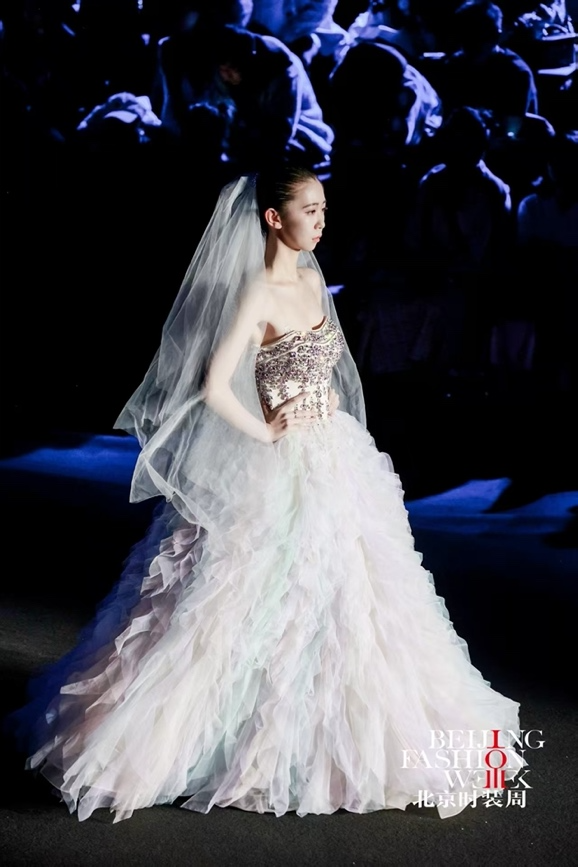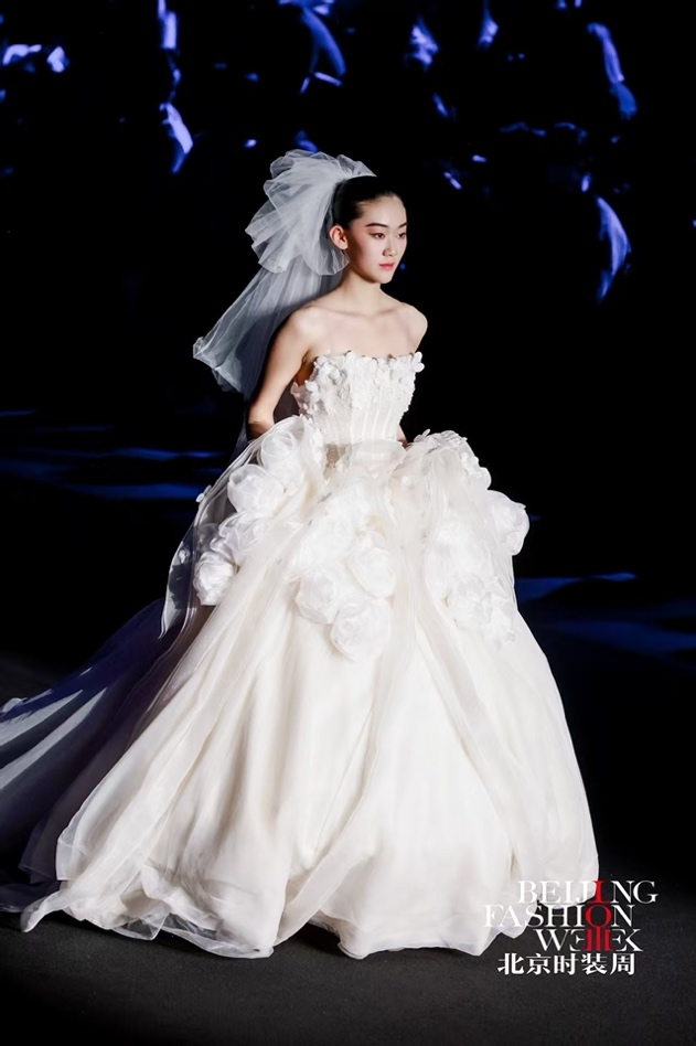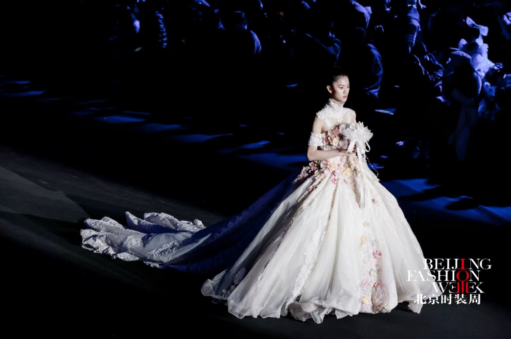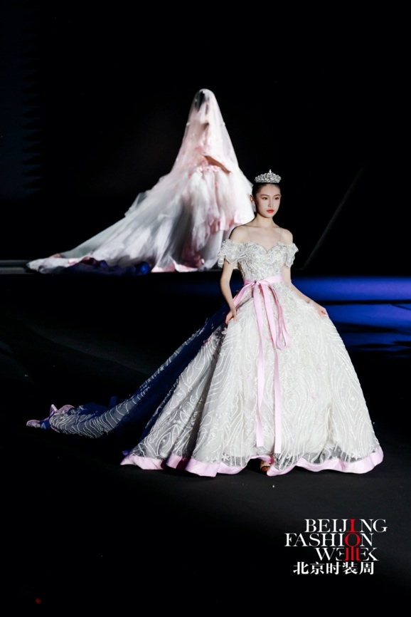 本季发布会以 “花田蕴生·绽放京彩”为主题,设计以“花田意象”为创作原点,将自然花田的生长与盛放转化为婚纱礼服的艺术语言,通过结构、色彩与材质的层层递进,构建一段从梦境萌芽到誓约永恒的情感叙事。在传统婚纱设计语言的基础上,系列作品融入立体装饰、结构塑形与现代工艺,使浪漫诗意与当代审美交织共生,呈现中国婚纱设计的新生力量。作品共呈现花影初梦、花海流光、炽焰花宴、花田誓约四大系列,以花田在不同光影时刻的变化隐喻爱情的不同阶段,在色彩与廓形的演进中描绘一段由初见、悸动到炽热、永恒的情感旅程。花影初梦系列以清晨花田初醒为灵感来源,薄雾轻覆,花影摇曳。设计通过轻盈廓形与柔美线条营造梦境般的氛围,象牙白、雾蓝与浅香槟色的柔和色调呈现出纯净宁静的视觉气质。层叠纱裙、立体花卉装饰与精致刺绣在欧根纱与轻盈网纱之间交织,使婚纱在步履之间展现柔和流动的浪漫诗意。