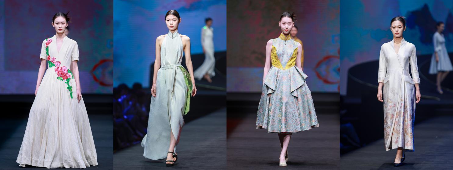 《初心·立春》篇章以纯净白为基底,辅以淡雅粉彩晕染,一袭简约白裙拉开发布会序幕,精准呼应青春年华的创意萌芽与初心坚守。任清君校友在分享中提及,求学期间的设计创作,正是在贴合市场需求的实践中,始终坚守创意本真的宝贵历程;《探索·夏竹》篇章以“竹”为设计内核,寓意“向光而生”的成长力量,服装剪裁从柔韧到挺括、廓形从宽松到立体的层层递进,具象化呈现了设计师在职业探索阶段的坚韧执着与突破创新;《繁华·秋华》篇章尽显岁月沉淀的文化厚重,传统纹样的深邃韵味在面料底色中晕染开来,宋锦、壮锦的华美质感随模特步履流转,西湖印象、饕餮纹样、梅兰竹菊、卷枝纹等经典元素凝练为宝相花的圆满意象,深刻诠释了传统文化赋予服装的精神内涵;《归真·冬藏》篇章以水墨意境为基调,主打松弛廓形与自然色彩,在“拥有”与“放下”的平衡中诠释设计本真,展现了设计师历经行业淬炼后的从容气度与智慧沉淀。