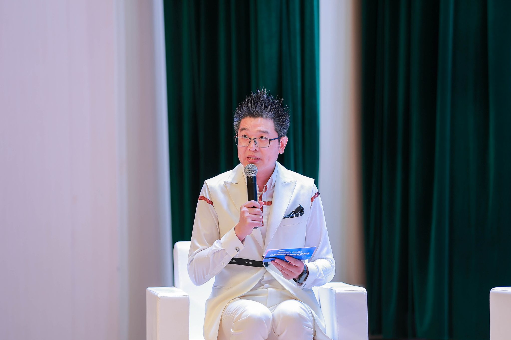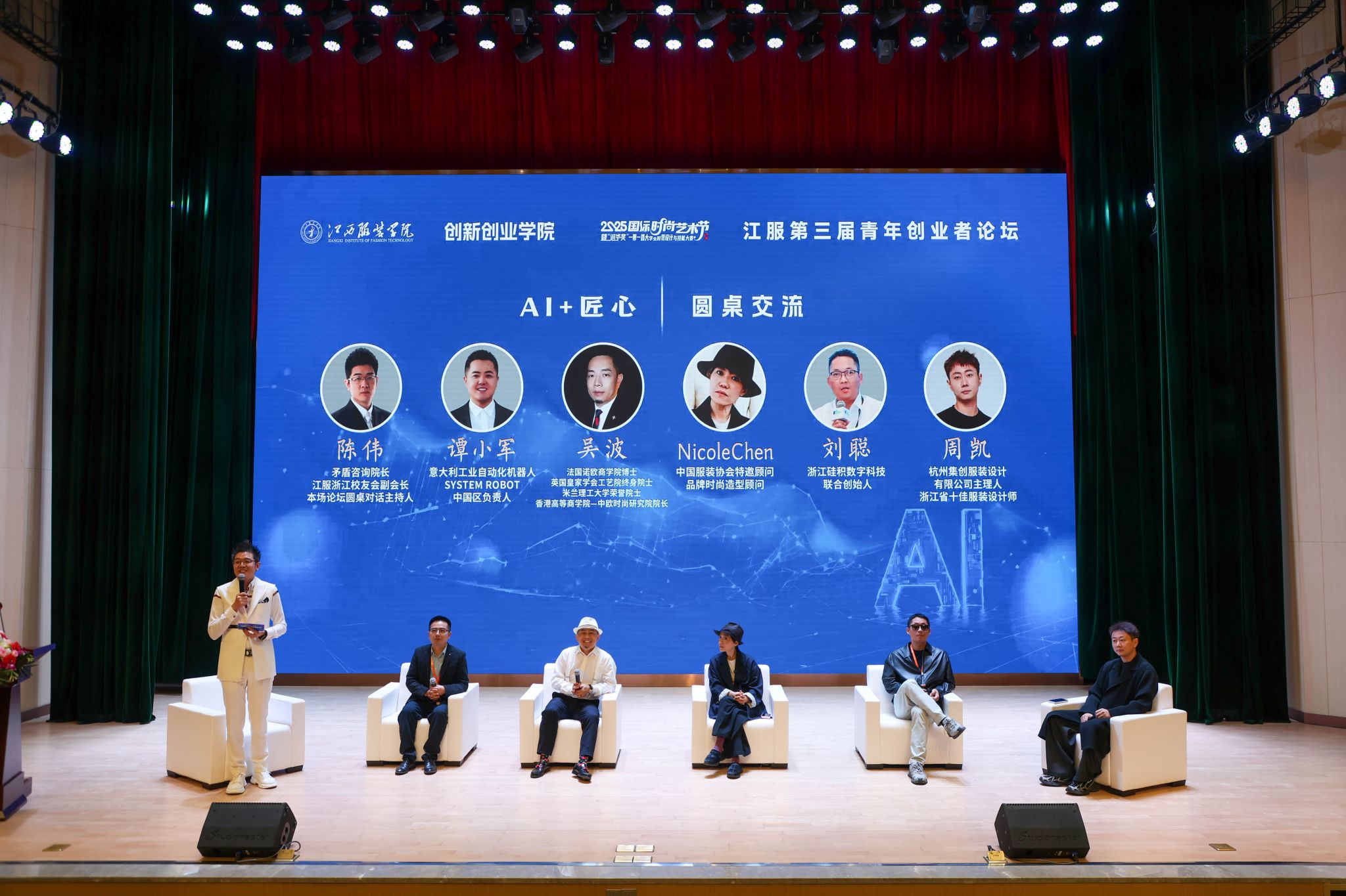 论坛后半程进入圆桌交流环节,特邀吴波、Nicole Chen、意大利工业自动化机器人SYSTEM ROBOT中国区负责人谭小军、刘聪、杭州集创服装设计有限公司主理人(浙江省十佳服装设计师)周凯五位嘉宾登台,由江服2004届校友、杭州矛盾商学院院长陈伟担任主持人。