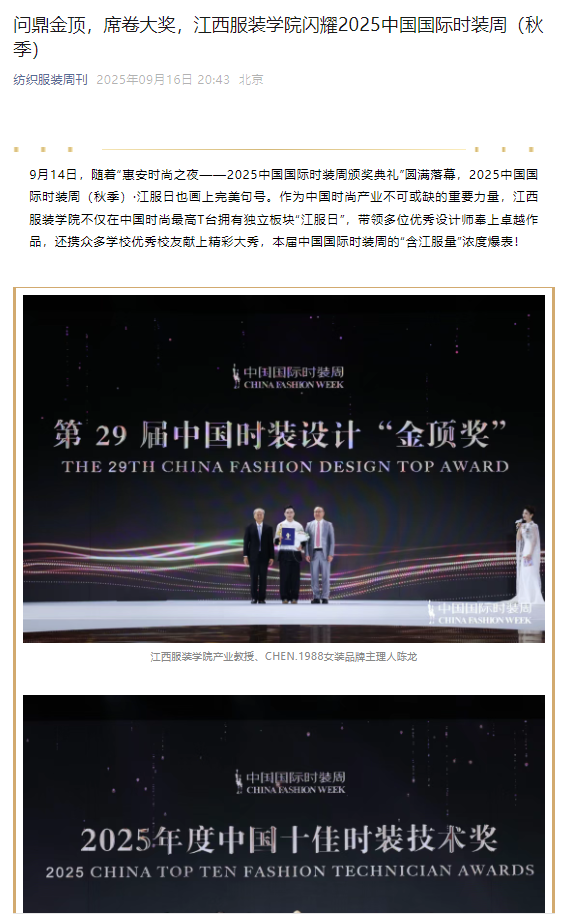 纺织服装周刊:问鼎金顶,席卷大奖,江西服装学院闪耀2025中国国际时装周(秋季)