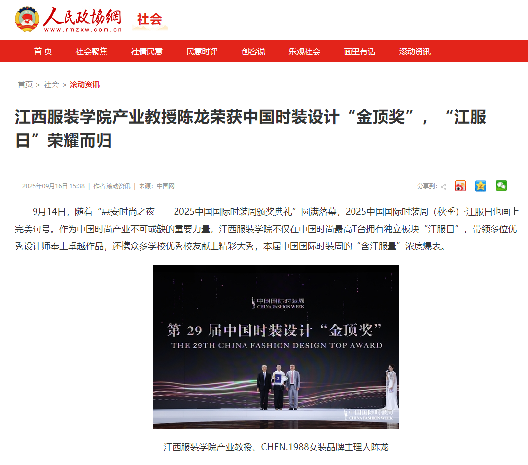 人民政协网:江西服装学院产业教授陈龙荣获中国时装设计“金顶奖”,“江服日”荣耀而归