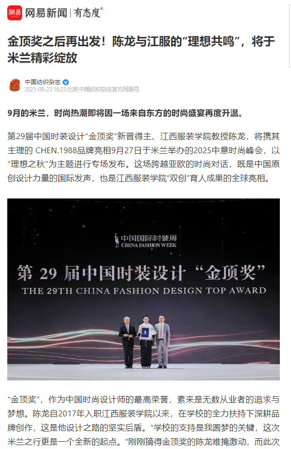 中国纺织杂志:金顶奖之后再出发!陈龙与江服的“理想共鸣”,将于米兰精彩绽放