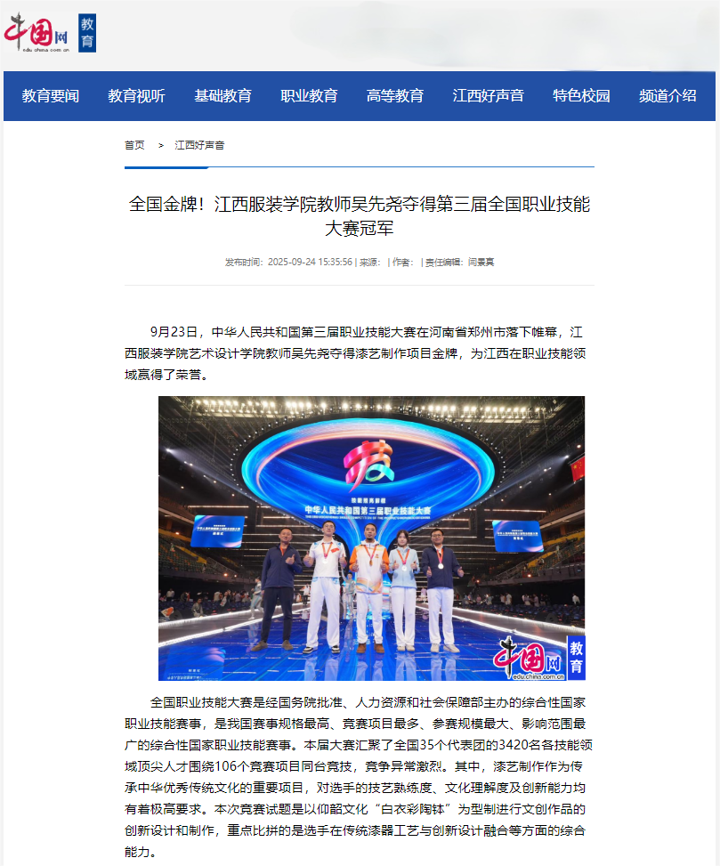 中国网:全国金牌!江西服装学院教师吴先尧夺得第三届全国职业技能大赛冠军