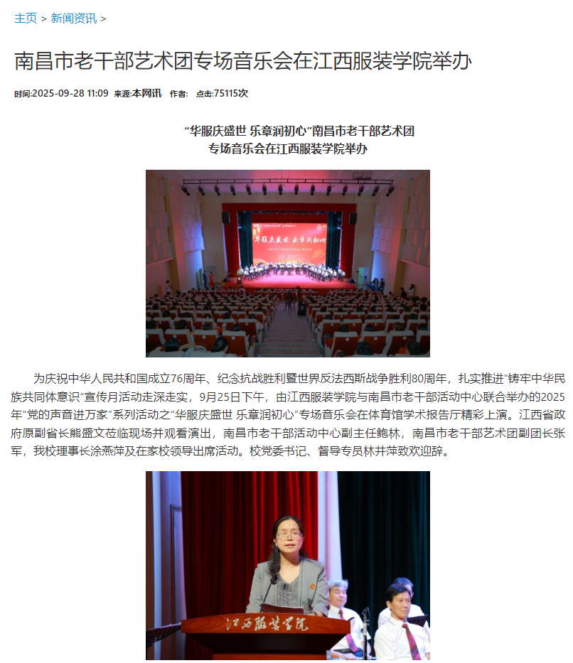 为庆祝中华人民共和国成立76周年、纪念抗战胜利暨世界反法西斯战争胜利80周年,扎实推进“铸牢中华民族共同体意识”宣传月活动走深走实,9月25日下午,由江西服装学院与南昌市老干部活动中心联合举办的2025年“党的声音进万家”系列活动之“华服庆盛世 乐章润初心”专场音乐会在体育馆学术报告厅精彩上演。江西省政府原副省长熊盛文莅临现场并观看演出,南昌市老干部活动中心副主任鲍林,南昌市老干部艺术团副团长张军,我校理事长涂燕萍及在家校领导出席活动。校党委书记、督导专员林井萍致欢迎辞。