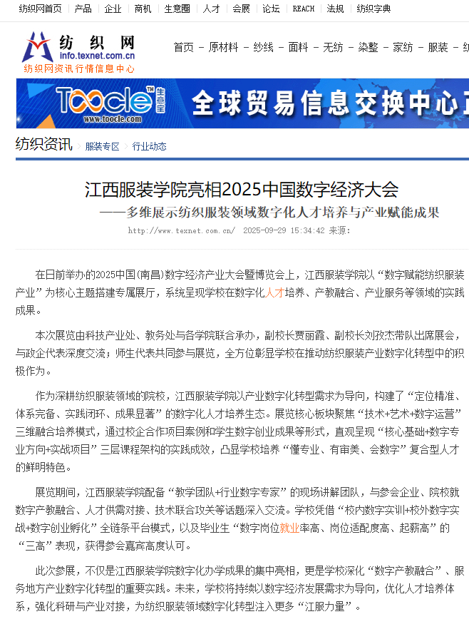 纺织网:江西服装学院亮相2025中国数字经济大会——多维展示纺织服装领域数字化人才培养与产业赋能成果