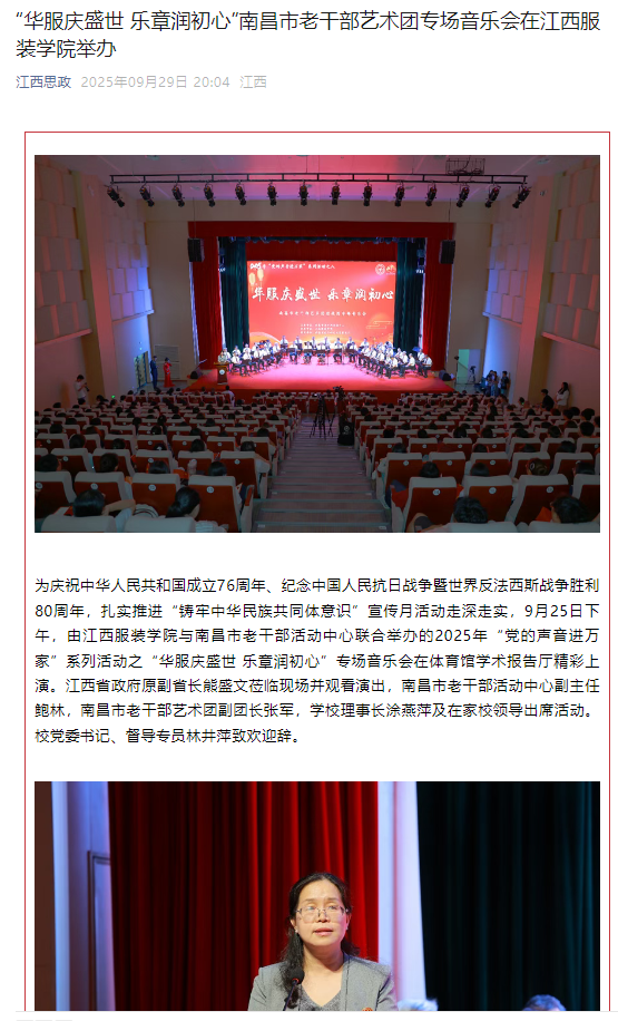 江西思政:“华服庆盛世 乐章润初心”南昌市老干部艺术团专场音乐会在江西服装学院举办