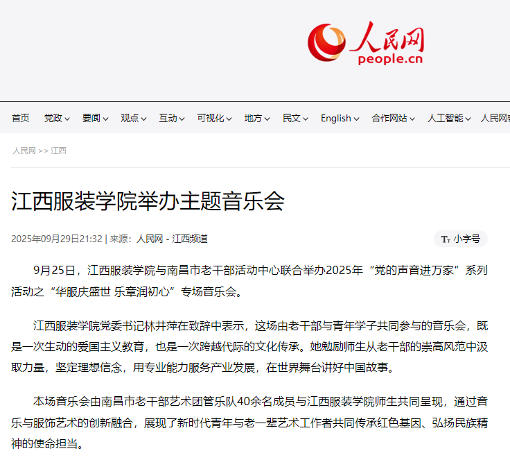 为庆祝中华人民共和国成立76周年、纪念中国人民抗日战争暨世界反法西斯战争胜利80周年,扎实推进“铸牢中华民族共同体意识”宣传月活动走深走实,9月25日下午,由江西服装学院与南昌市老干部活动中心联合举办的2025年“党的声音进万家”系列活动之“华服庆盛世 乐章润初心”专场音乐会在体育馆学术报告厅精彩上演。江西省政府原副省长熊盛文莅临现场并观看演出,南昌市老干部活动中心副主任鲍林,南昌市老干部艺术团副团长张军,学校理事长涂燕萍及在家校领导出席活动。校党委书记、督导专员林井萍致欢迎辞。